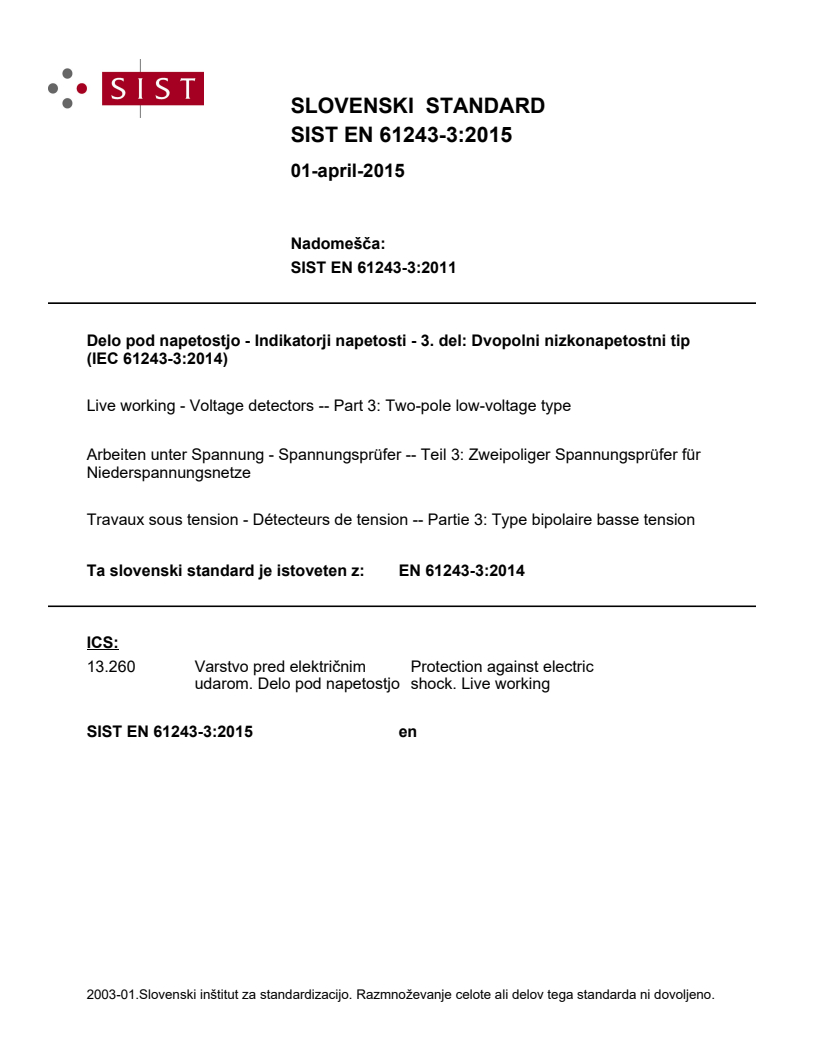 Keywords: voltage detectors, live working, two‑pole low‑voltage, SIST EN 61243‑3:2015, IEC 61243‑3, safety requirements, interference voltages, phase indication, continuity check, EMC.