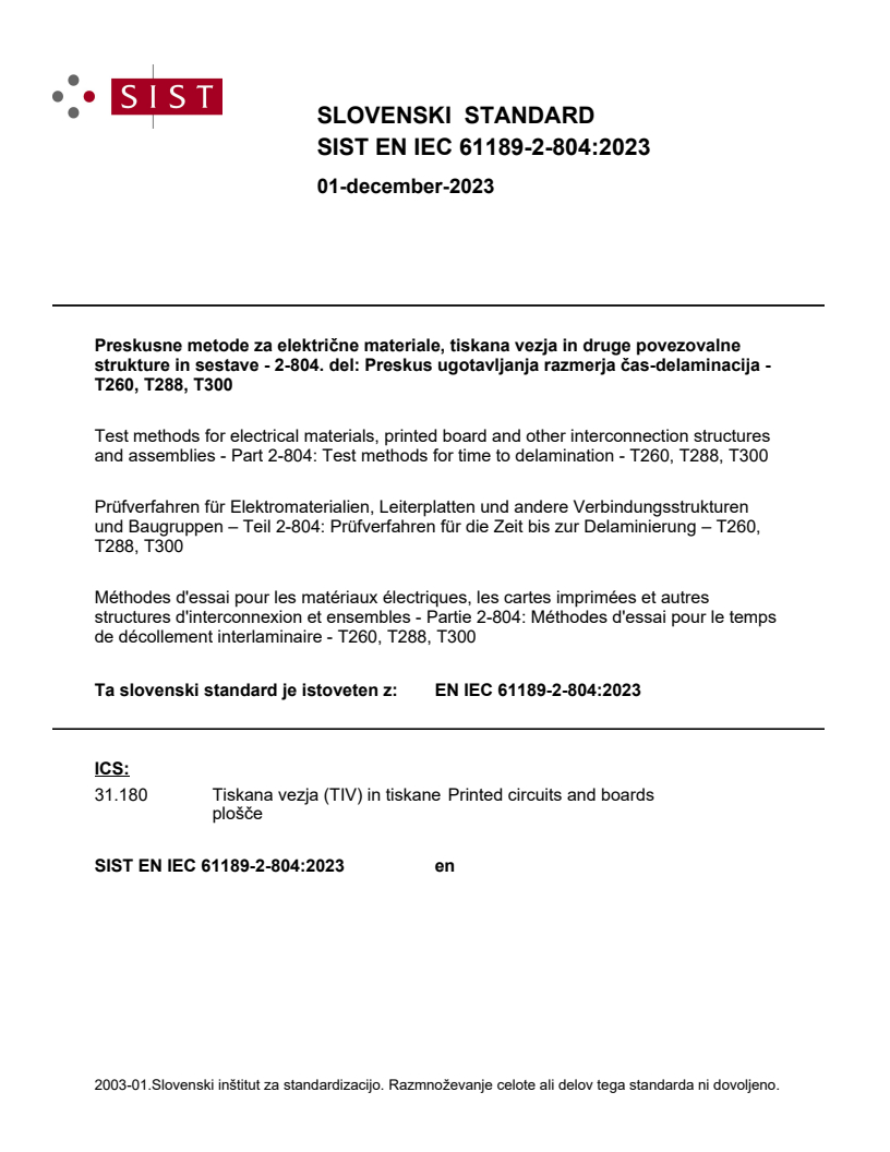 EN IEC 61189-2-804:2023 is a standard published by CLC. Its full title is "Test methods for electrical materials, printed board and other interconnection structures and assemblies - Part 2-804: Test methods for time to delamination - T260, T288, T300". This standard covers: This International Standard specifies a test method to determine the time to delamination of base materials and printed boards using a thermomechanical analyzer (TMA). Temperatures used for this evaluation are typically 260 °C, 288 °C and 300 ºC, but are not limited to these values.