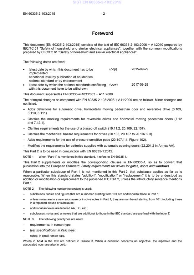 EN 60335-2-103:2015 - “Household and similar electrical appliances - Safety - Part 2-103: Particular requirements for drives for gates, doors and windows” is a CLC/CENELEC standard that specifies safety requirements for electric drives for gates, doors and windows used in household and similar environments. It applies to drives with rated voltages up to 250 V (single‑phase) and 480 V (other) and covers hazards associated with the movement of the driven part. This Part 2 is to be read in conjunction with EN/IEC 60335‑1 (general appliance safety) and supports conformity with the EU Machinery Directive 2006/42/EC.