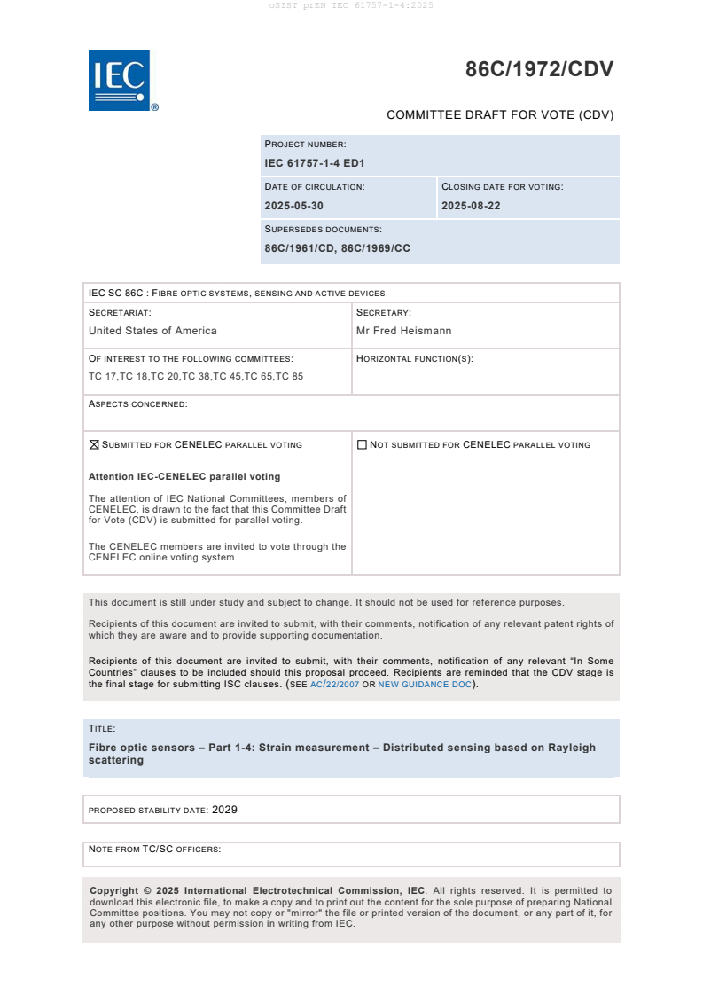 The international standard prEN IEC 61757-1-4:2025, titled Fibre Optic Sensors - Part 1-4: Strain Measurement - Distributed Sensing Based on Rayleigh Scattering, defines essential terminology, structure, and standardized measurement methods for distributed fibre optic strain sensors. It focuses on absolute strain measurements using spectral correlation analysis of Rayleigh backscattering signatures in single-mode optical fibres. Covering measurement ranges from approximately 10 meters to tens of kilometers, this standard is pivotal for ensuring consistent, high-quality performance in fibre optic distributed strain sensing systems.