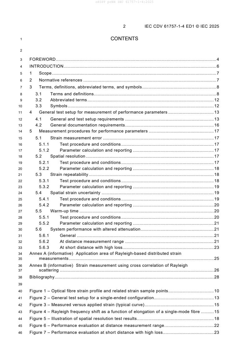 Scope and Applicability: Defines distributed strain sensing utilizing Rayleigh scattering signals in single-mode fibres over extended lengths, with a focus on absolute strain measurement rather than point or dynamic sensing. Related Brillouin scattering measurements are covered in IEC 61757-1-2.
