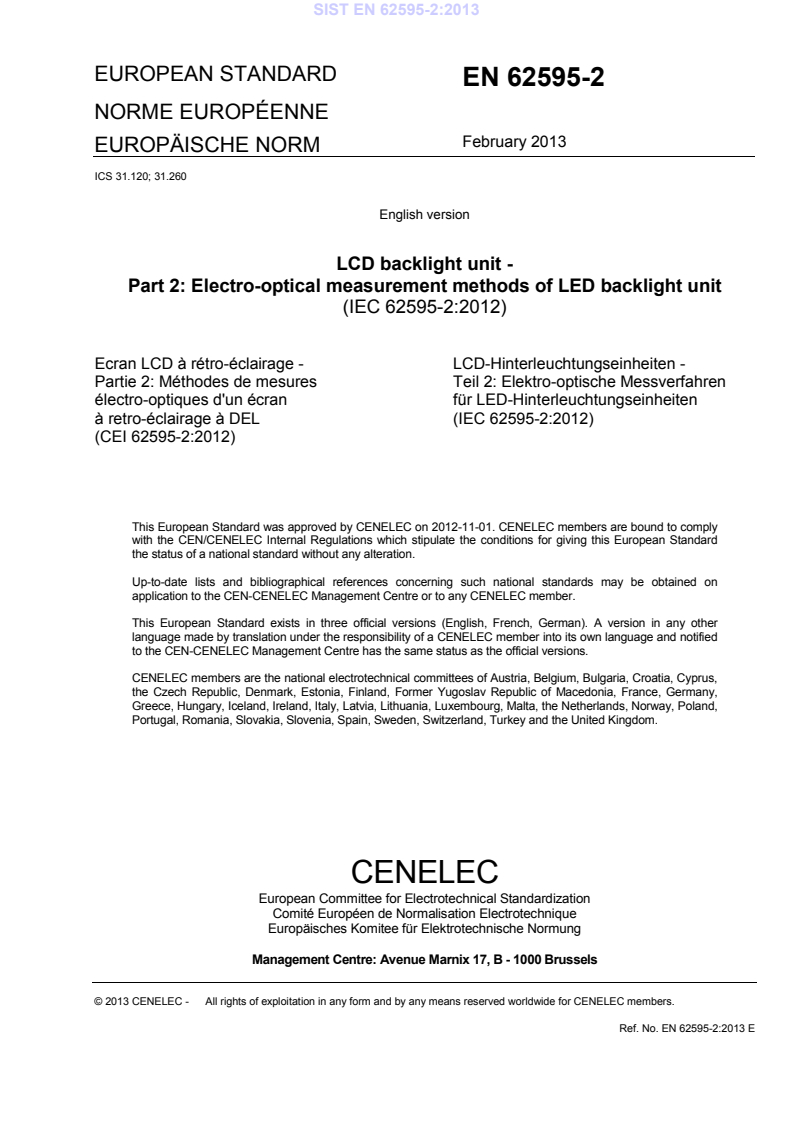 EN 62595-2:2013 is a standard published by CLC. Its full title is "LCD backlight unit - Part 2: Electro-optical measurement methods of LED backlight unit". This standard covers: IEC 62595-2:2012 specifies the standard measurement conditions and measuring methods for determining electrical, optical, and electro-optical parameters of LED backlight units for liquid crystal displays. NOTE: Other backlights (Cold Cathode Fluorescent Lamps (CCFLs), External Electrode Fluorescent Lamps (EEFLs), Hot Cathode Fluorescent Lamps (HCFLs), Carbon Nano Tube (CNT), etc.) are excluded from this standard.