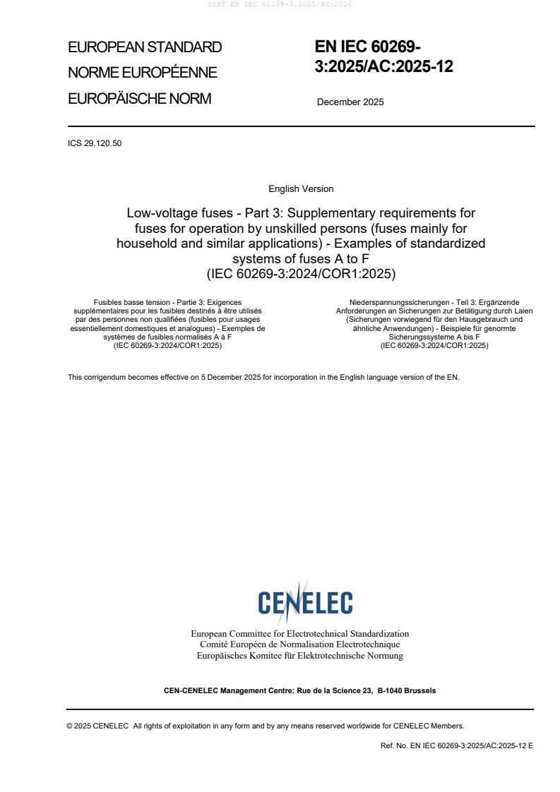 The text of the corrigendum IEC 60269-3:2024/COR1:2025 was approved by CENELEC as EN IEC 60269-3:2025/AC:2025-12 without any