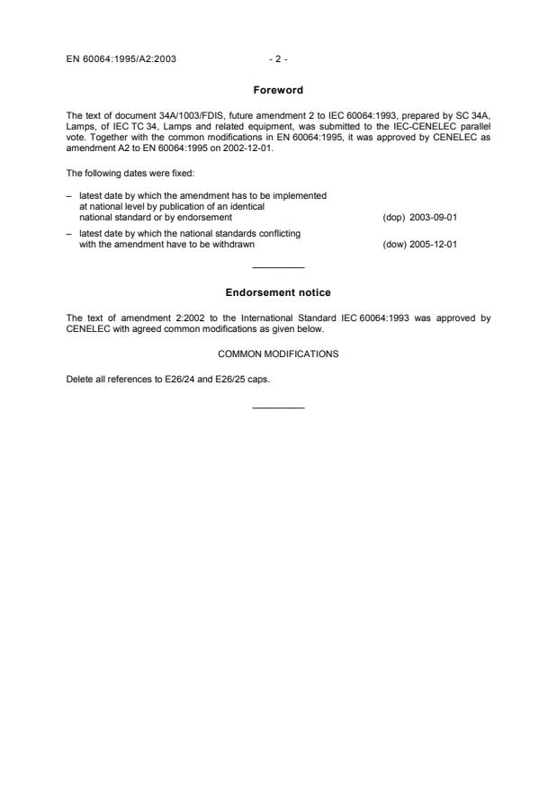 This amendment A2 modifies the European Standard EN 60064:1995; it was approved by CENELEC on