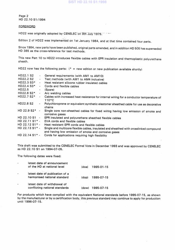 HD 22.10 S1:1994 is a standardization document published by CLC. Its full title is "Rubber insulated cables of rated voltages up to and including 450/750 V - Part 10: EPR insulated and polyurethane sheathed flexible cable". This standard covers: This Part 10 of the HD details the particular requirements for ethylene-propylene rubber insulated, and thermoplastic polyurethane sheathed cable for a maximum conductor temperature of 90øC and lowest handling temperature of -40øC. Each cable shall comply with the appropriate requirements given in Part 1 of this HD and the particular requirements of this Part. NOTE 1 : The sheath specified in this Part of HD 22 is unvulcanised. The requirements and special additional test methods are therefore included as Annex A to this Part. NOTE 2: The overall dimensions of the cables in this Part of HD 22 have been calculated in accordance with EN 60719.
