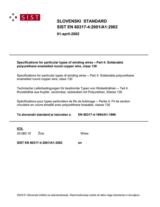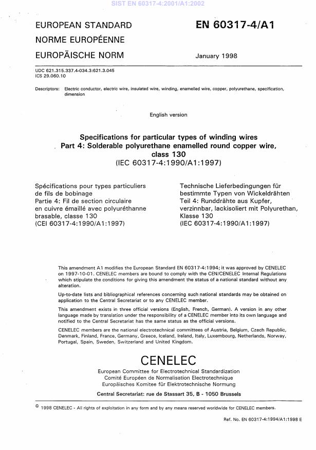 EN 60317-4:1994/A1:1998 is a amendment published by CLC. Its full title is "Specifications for particular types of winding wires - Part 4: Solderable polyurethane enamelled round copper wire, class 130". This standard covers: This amendment 1 is valid for the following parts of the IEC 60317: Part 2 (1990), Part 3 (1990), Part 4 (1990), Part 10 (1972), Part 12 (1990), Part 14 (1990), Part 15 (1990), Part 16 (1990), Part 17 (1990), Part 18 (1990), Part 19 (1990), Part 20 (1990), Part 21 (1990), Part 22 (1990), Part 23 (1990), Part 24 (1990), Part 26 (1990), Part 28 (1990), Part 29 (1990), Part 30 (1990), Part 35 (1992), Part 36 (1992), Part 37 (1992) and Part 38 (1992).