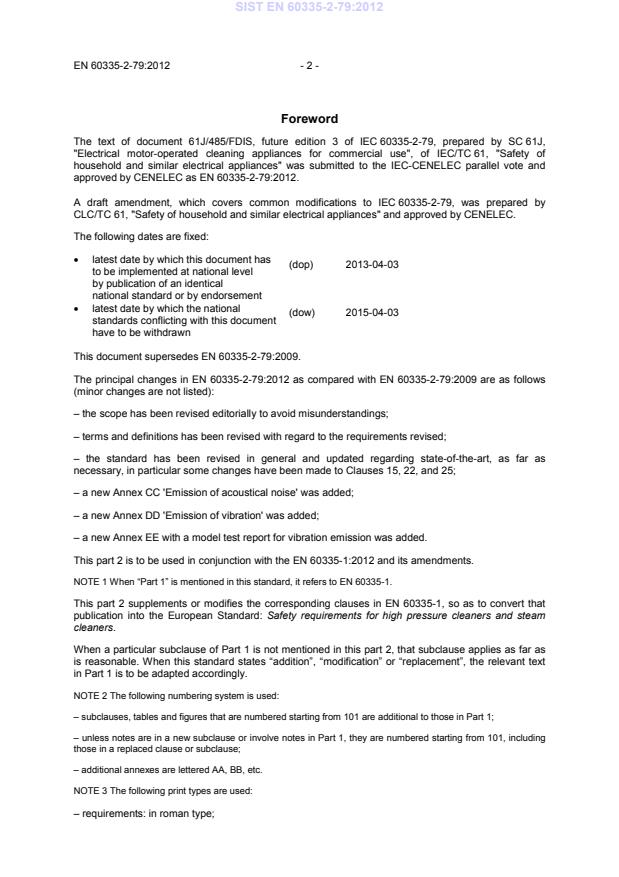 EN 60335-2-79:2012 is a standard published by CLC. Its full title is "Household and similar electrical appliances - Safety - Part 2-79: Particular requirements for high pressure cleaners and steam cleaners". This standard covers: IEC 60335-2-79:2012(E) deals with the safety of high-pressure cleaners without traction drive, intended for household and commercial indoor or outdoor use, having a rated pressure not less than 2,5 MPa and not exceeding 35 MPa. It also applies to steam cleaners and those parts of hot water high pressure cleaners incorporating a steam stage which have a capacity not exceeding 100 l, a rated pressure not exceeding 2,5 MPa and a product of capacity and rated pressure not exceeding 5 MPa x l. They are not equipped with a traction drive. The following power systems of the drive for the high pressure pump are covered: - mains powered motors up to a rated voltage of 250 V for single-phase machines and 480 V for other machines, - battery powered motors, - internal combustion engines and - hydraulic or pneumatic motors. This third edition cancels and replaces the second edition published in 2002 and its Amendments 1 (2004) and 2 (2007). It constitutes a technical revision. The principal changes in this edition as compared with the second edition of IEC 60335-2-79 are as follows (minor changes are not listed): - the scope has been revised editorially to avoid misunderstandings; - terms and definitions has been revised with regard to the requirements revised; - the standard has been revised in general and updated regarding state-of-the-art, as far as necessary, in particular some changes have been made to Clauses 15, 22, and 25; - a new Annex CC 'Emission of acoustical noise' was added; - a new Annex DD 'Emission of vibration' was added and - a new Annex EE with a model test report for vibration emission was added. This publication is to be read in conjunction with IEC 60335-1:2010.