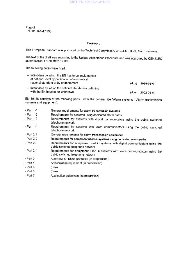 EN 50136-1-4:1998 is a standard published by CLC. Its full title is "Alarm systems - Alarm transmission systems and equipment - Part 1-4: Requirements for systems with voice communicators using the public switched telephone network". This standard covers: This standard specifies the requirements for voice communicator systems utilising the Public Switched Telephone Network which are in addition to those specified in EN 50136-1-1. It covers switched connections providing event driven signaling between an alarm system and a remote centre. The information will be transmitted by using a stored voice message to one or more responsible persons and/or to an alarm -receiving centre successively