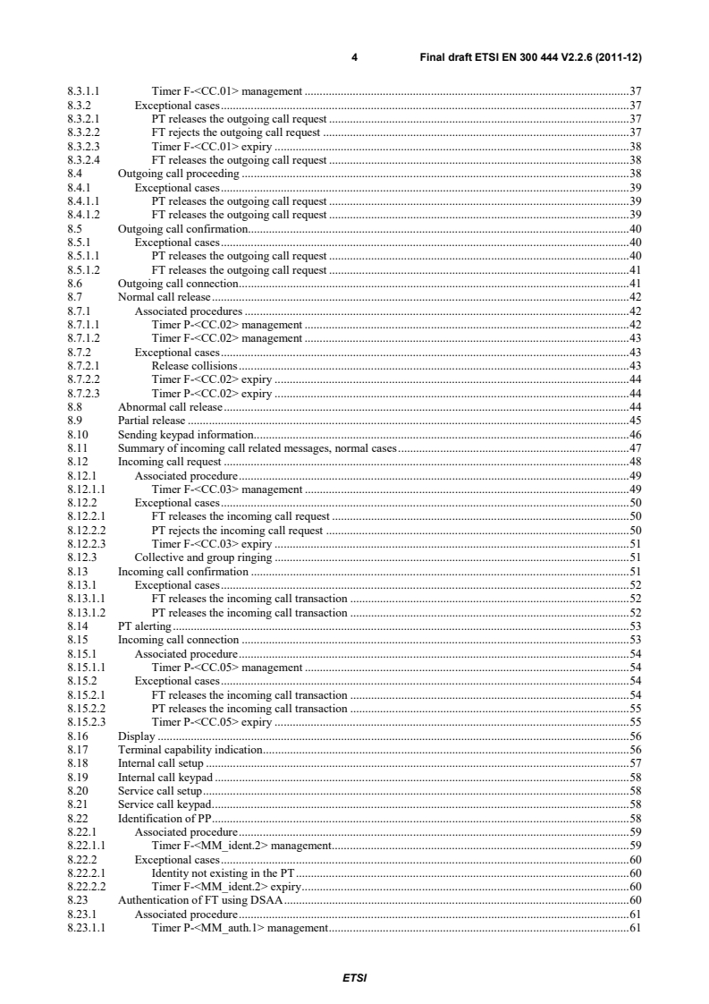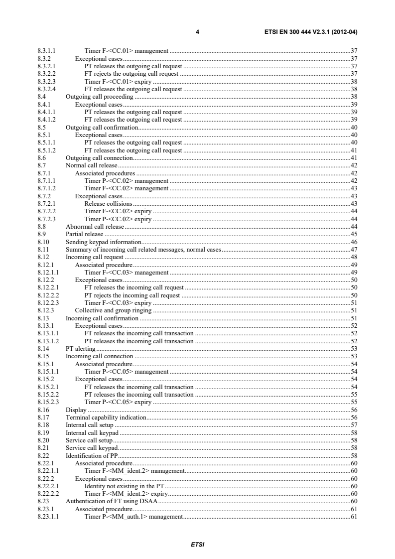 ETSI ETSI EN 300 444 V2.3.1 (2012-04) 4 8.3.1.1 Timer F- management . 37 8.3.2 Exceptional cases . 37 8.3.2.1 PT releases the outgoing call request . 37 8.3.2.2 FT rejects the outgoing call request . 37 8.3.2.3 Timer F- expiry . 38 8.3.2.4 FT releases the outgoing call request . 38 8.4 Outgoing call proceeding . 38 8.4.1 Exceptional cases . 39 8.4.1.1 PT releases the outgoing call request . 39 8.4.1.2 FT releases the outgoing call request . 39 8.5 Outgoing call confirmation. 40 8.5.1 Exceptional cases . 40 8.5.1.1 PT releases the outgoing call request . 40 8.5.1.2 FT releases the outgoing call request . 41 8.6 Outgoing call connection . 41 8.7 Normal call release . 42 8.7.1 Associated procedures . 42 8.7.1.1 Timer P- management . 42 8.7.1.2 Timer F- management . 43 8.7.2 Exceptional cases . 43 8.7.2.1 Release collisions . 43 8.7.2.2 Timer F- expiry . 44 8.7.2.3 Timer P- expiry . 44 8.8 Abnormal call release . 44 8.9 Partial release . 45 8.10 Sending keypad information. 46 8.11 Summary of incoming call related messages, normal cases . 47 8.12 Incoming call request . 48 8.12.1 Associated procedure . 49 8.12.1.1 Timer F- management . 49 8.12.2 Exceptional cases . 50 8.12.2.1 FT releases the incoming call request . 50 8.12.2.2 PT rejects the incoming call request . 50 8.12.2.3 Timer F- expiry . 51 8.12.3 Collective and group ringing . 51 8.13 Incoming call confirmation . 51 8.13.1 Exceptional cases . 52 8.13.1.1 FT releases the incoming call transaction . 52 8.13.1.2 PT releases the incoming call transaction . 52 8.14 PT alerting . 53 8.15 Incoming call connection . 53 8.15.1 Associated procedure . 54 8.15.1.1 Timer P- management . 54 8.15.2 Exceptional cases . 54 8.15.2.1 FT releases the incoming call transaction . 54 8.15.2.2 PT releases the incoming call transaction . 55 8.15.2.3 Timer P- expiry . 55 8.16 Display . 56 8.17 Terminal capability indication . 56 8.18 Internal call setup . 57 8.19 Internal call keypad . 58 8.20 Service call setup . 58 8.21 Service call keypad . 58 8.22 Identification of PP . 58 8.22.1 Associated procedure . 60 8.22.1.1 Timer F- management . 60 8.22.2 Exceptional cases . 60 8.22.2.1 Identity not existing in the PT . 60 8.22.2.2 Timer F- expiry . 60 8.23 Authentication of FT using DSAA . 60 8.23.1 Associated procedure . 61 8.23.1.1 Timer P- management . 61 SIST EN 300 444 V2.3.1:2012