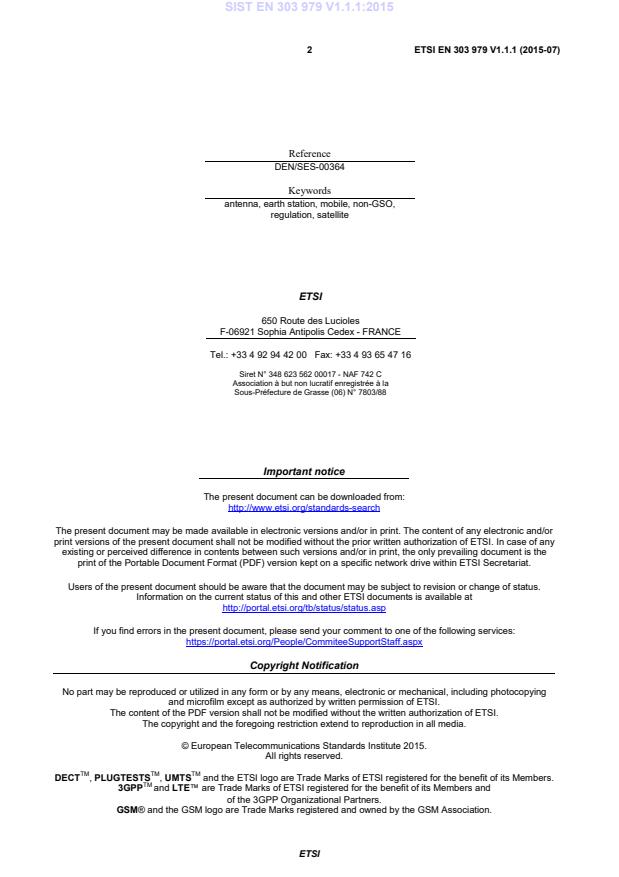 DECTTM, PLUGTESTSTM, UMTSTM and the ETSI logo are Trade Marks of ETSI registered for the benefit of its Members. 3GPPTM and LTE™ are Trade Marks of ETSI registered for the benefit of its Members and of the 3GPP Organizational Partners. GSM® and the GSM logo are Trade Marks registered and owned by the GSM Association. SIST EN 303 979 V1.1.1:2015