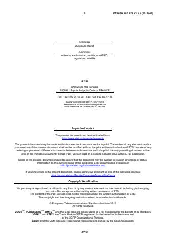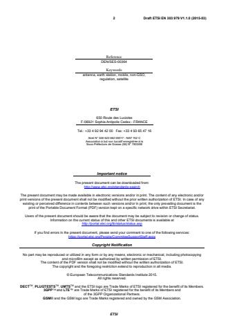 Modal verbs terminology In the present document "shall", "shall not", "should", "should not", "may", "need not", "will", "will not", "can" and "cannot" are to be interpreted as described in clause 3.2 of the ETSI Drafting Rules (Verbal forms for the expression of provisions). "must" and "must not" are NOT allowed in ETSI deliverables except when used in direct citation. Introduction The present document is part of a set of standards developed by ETSI and is designed to fit in a modular structure to cover all radio and telecommunications terminal equipment within the scope of the R&TTE Directive [i.2]. The modular structure is shown in ETSI EG 201 399 [i.3]. The present document is largely based on ETSI EN 303 978 [i.7], for ESOMPs operating with GSO satellites. SIST EN 303 979 V1.1.1:2015