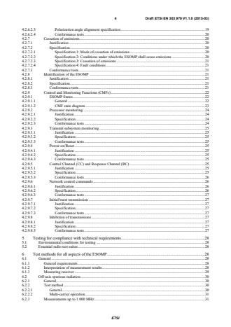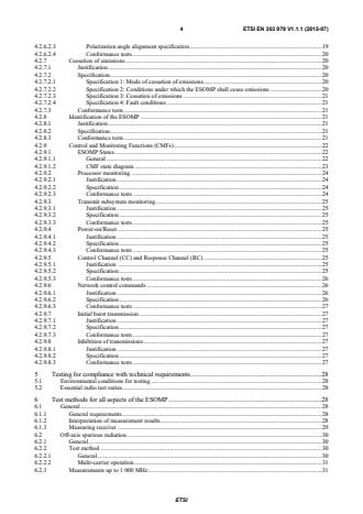 ETSI ETSI EN 303 979 V1.1.1 (2015-07) 4 4.2.6.2.3 Polarization angle alignment specification . 19 4.2.6.2.4 Conformance tests . 20 4.2.7 Cessation of emissions . 20 4.2.7.1 Justification . 20 4.2.7.2 Specification. 20 4.2.7.2.1 Specification 1: Mode of cessation of emissions . 20 4.2.7.2.2 Specification 2: Conditions under which the ESOMP shall cease emissions . 20 4.2.7.2.3 Specification 3: Cessation of emissions . 21 4.2.7.2.4 Specification 4: Fault conditions . 21 4.2.7.3 Conformance tests . 21 4.2.8 Identification of the ESOMP . 21 4.2.8.1 Justification . 21 4.2.8.2 Specification. 21 4.2.8.3 Conformance tests . 21 4.2.9 Control and Monitoring Functions (CMFs) . 22 4.2.9.1 ESOMP States . 22 4.2.9.1.1 General . 22 4.2.9.1.2 CMF state diagram . 23 4.2.9.2 Processor monitoring . 24 4.2.9.2.1 Justification . 24 4.2.9.2.2 Specification . 24 4.2.9.2.3 Conformance tests . 24 4.2.9.3 Transmit subsystem monitoring . 25 4.2.9.3.1 Justification . 25 4.2.9.3.2 Specification . 25 4.2.9.3.3 Conformance tests . 25 4.2.9.4 Power-on/Reset . 25 4.2.9.4.1 Justification . 25 4.2.9.4.2 Specification . 25 4.2.9.4.3 Conformance tests . 25 4.2.9.5 Control Channel (CC) and Response Channel (RC) . 25 4.2.9.5.1 Justification . 25 4.2.9.5.2 Specification . 25 4.2.9.5.3 Conformance tests . 26 4.2.9.6 Network control commands . 26 4.2.9.6.1 Justification . 26 4.2.9.6.2 Specification . 26 4.2.9.6.3 Conformance tests . 27 4.2.9.7 Initial burst transmission . 27 4.2.9.7.1 Justification . 27 4.2.9.7.2 Specification . 27 4.2.9.7.3 Conformance tests . 27 4.2.9.8 Inhibition of transmissions . 27 4.2.9.8.1 Justification . 27 4.2.9.8.2 Specification . 27 4.2.9.8.3 Conformance tests . 27 5 Testing for compliance with technical requirements . 28 5.1 Environmental conditions for testing . 28 5.2 Essential radio test suites . 28 6 Test methods for all aspects of the ESOMP . 28 6.1 General . 28 6.1.1 General requirements . 28 6.1.2 Interpretation of measurement results . 28 6.1.3 Measuring receiver . 29 6.2 Off-axis spurious radiation . 30 6.2.1 General . 30 6.2.2 Test method . 30 6.2.2.1 General . 30 6.2.2.2 Multi-carrier operation . 31 6.2.3 Measurements up to 1 000 MHz . 31 SIST EN 303 979 V1.1.1:2015