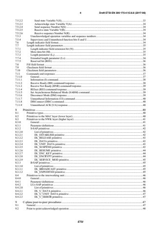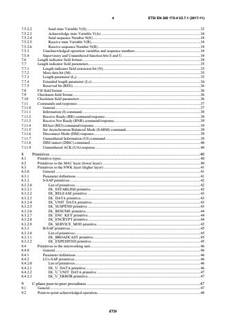 ETSI ETSI EN 300 175-4 V2.7.1 (2017-11) 4 7.5.2.2 Send state Variable V(S) . 33 7.5.2.3 Acknowledge state Variable V(A) . 34 7.5.2.4 Send sequence Number N(S) . 34 7.5.2.5 Receive state Variable V(R) . 34 7.5.2.6 Receive sequence Number N(R) . 34 7.5.3 Unacknowledged operation variables and sequence numbers . 34 7.5.4 Supervisory and Unnumbered function bits S and U . 34 7.6 Length indicator field format. 34 7.7 Length indicator field parameters . 35 7.7.1 Length indicator field extension bit (N) . 35 7.7.2 More data bit (M) . 35 7.7.3 Length parameter (LI) . 35 7.7.4 Extended length parameter (LJJ) . 36 7.7.5 Reserved bit (RES) . 36 7.8 Fill field format . 36 7.9 Checksum field format . 36 7.10 Checksum field parameters . 36 7.11 Commands and responses . 37 7.11.0 General . 37 7.11.1 Information (I) command . 38 7.11.2 Receive Ready (RR) command/response . 38 7.11.3 Receive Not Ready (RNR) command/response . 39 7.11.4 REJect (REJ) command/response . 39 7.11.5 Set Asynchronous Balanced Mode (SABM) command . 39 7.11.6 Disconnect Mode (DM) response . 39 7.11.7 Unnumbered Information (UI) command . 39 7.11.8 DISConnect (DISC) command . 40 7.11.9 Unnumbered ACK (UA) response . 40 8 Primitives . 40 8.1 Primitive types . 40 8.2 Primitives to the MAC layer (lower layer) . 40 8.3 Primitives to the NWK layer (higher layer) . 41 8.3.0 General . 41 8.3.1 Parameter definitions . 41 8.3.2 S-SAP primitives . 42 8.3.2.0 List of primitives . 42 8.3.2.1 DL_ESTABLISH primitive . 42 8.3.2.2 DL_RELEASE primitive . 43 8.3.2.3 DL_DATA primitive . 43 8.3.2.4 DL_UNIT_DATA primitive . 43 8.3.2.5 DL_SUSPEND primitive . 43 8.3.2.6 DL_RESUME primitive . 44 8.3.2.7 DL_ENC_KEY primitive . 44 8.3.2.8 DL_ENCRYPT primitive . 44 8.3.2.9 DL_SERVICE_MOD primitive . 45 8.3.3 B-SAP primitives . 45 8.3.3.0 List of primitives . 45 8.3.3.1 DL_BROADCAST primitive . 45 8.3.3.2 DL_EXPEDITED primitive . 45 8.4 Primitives to the interworking unit . 46 8.4.0 General . 46 8.4.1 Parameter definitions . 46 8.4.2 LUX-SAP primitives . 46 8.4.2.0 List of primitives . 46 8.4.2.1 DL_U_DATA primitive . 46 8.4.2.2 DL_U_UNIT_DATA primitive . 47 8.4.2.3 DL_U_ERROR primitive . 47 9 C-plane peer-to-peer procedures . 47 9.1 General . 47 9.2 Point-to-point acknowledged operation. 48 SIST EN 300 175-4 V2.7.1:2018
