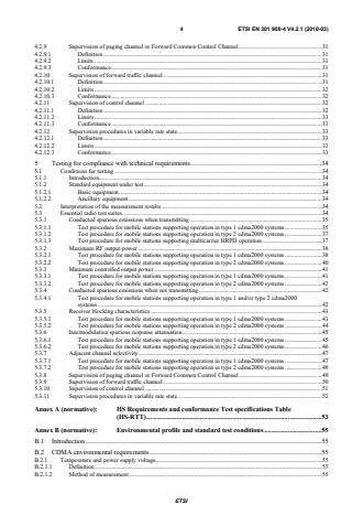 ETSI ETSI EN 301 908-4 V4.2.1 (2010-03) 4 4.2.9 Supervision of paging channel or Forward Common Control Channel . 31 4.2.9.1 Definition . 31 4.2.9.2 Limits . 31 4.2.9.3 Conformance . 31 4.2.10 Supervision of forward traffic channel . 31 4.2.10.1 Definition . 31 4.2.10.2 Limits . 32 4.2.10.3 Conformance . 32 4.2.11 Supervision of control channel . 32 4.2.11.1 Definition . 32 4.2.11.2 Limits . 33 4.2.11.3 Conformance . 33 4.2.12 Supervision procedures in variable rate state . 33 4.2.12.1 Definition . 33 4.2.12.2 Limits . 33 4.2.12.3 Conformance . 33 5 Testing for compliance with technical requirements . 34 5.1 Conditions for testing . 34 5.1.1 Introduction. 34 5.1.2 Standard equipment under test . 34 5.1.2.1 Basic equipment . 34 5.1.2.2 Ancillary equipment . 34 5.2 Interpretation of the measurement results . 34 5.3 Essential radio test suites . 34 5.3.1 Conducted spurious emissions when transmitting . 35 5.3.1.1 Test procedure for mobile stations supporting operation in type 1 cdma2000 systems . 35 5.3.1.2 Test procedure for mobile stations supporting operation in type 2 cdma2000 systems . 37 5.3.1.3 Test procedure for mobile stations supporting multicarrier HRPD operation . 37 5.3.2 Maximum RF output power . 38 5.3.2.1 Test procedure for mobile stations supporting operation in type 1 cdma2000 systems . 38 5.3.2.2 Test procedure for mobile stations supporting operation in type 2 cdma2000 systems . 40 5.3.3 Minimum controlled output power . 41 5.3.3.1 Test procedure for mobile stations supporting operation in type 1 cdma2000 systems . 41 5.3.3.2 Test procedure for mobile stations supporting operation in type 2 cdma2000 systems . 42 5.3.4 Conducted spurious emissions when not transmitting . 42 5.3.4.1 Test procedure for mobile stations supporting operation in type 1 and/or type 2 cdma2000 systems . 42 5.3.5 Receiver blocking characteristics . 43 5.3.5.1 Test procedure for mobile stations supporting operation in type 1 cdma2000 systems . 43 5.3.5.2 Test procedure for mobile stations supporting operation in type 2 cdma2000 systems . 44 5.3.6 Intermodulation spurious response attenuation . 45 5.3.6.1 Test procedure for mobile stations supporting operation in type 1 cdma2000 systems . 45 5.3.6.2 Test procedure for mobile stations supporting operation in type 2 cdma2000 systems . 46 5.3.7 Adjacent channel selectivity . 47 5.3.7.1 Test procedure for mobile stations supporting operation in type 1 cdma2000 systems . 47 5.3.7.2 Test procedure for mobile stations supporting operation in type 2 cdma2000 systems . 48 5.3.8 Supervision of paging channel or Forward Common Control Channel . 49 5.3.9 Supervision of forward traffic channel . 50 5.3.10 Supervision of control channel . 51 5.3.11 Supervision procedures in variable rate state . 52 Annex A (normative): HS Requirements and conformance Test specifications Table (HS-RTT) . 53 Annex B (normative): Environmental profile and standard test conditions . 55 B.1 Introduction . 55 B.2 CDMA environmental requirements . 55 B.2.1 Temperature and power supply voltage . 55 B.2.1.1 Definition . 55 B.2.1.2 Method of measurement . 55 SIST EN 301 908-4 V4.2.1:2010