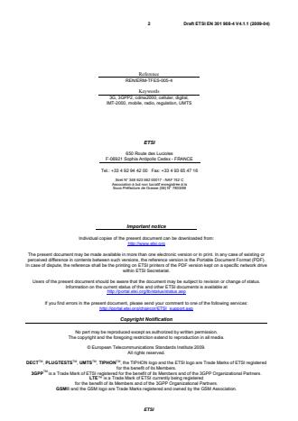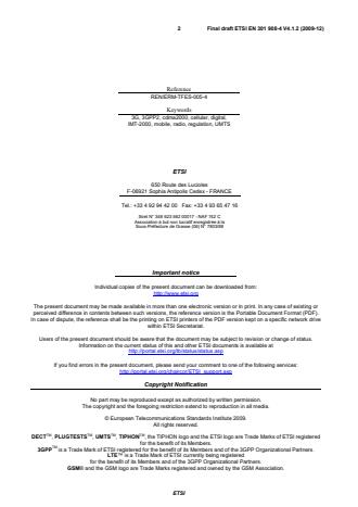 Important notice Individual copies of the present document can be downloaded from: http://www.etsi.org The present document may be made available in more than one electronic version or in print. In any case of existing or perceived difference in contents between such versions, the reference version is the Portable Document Format (PDF). In case of dispute, the reference shall be the printing on ETSI printers of the PDF version kept on a specific network drive within ETSI Secretariat. Users of the present document should be aware that the document may be subject to revision or change of status. Information on the current status of this and other ETSI documents is available at http://portal.etsi.org/tb/status/status.asp If you find errors in the present document, please send your comment to one of the following services: http://portal.etsi.org/chaircor/ETSI_support.asp Copyright Notification No part may be reproduced except as authorized by written permission. The copyright and the foregoing restriction extend to reproduction in all media.
