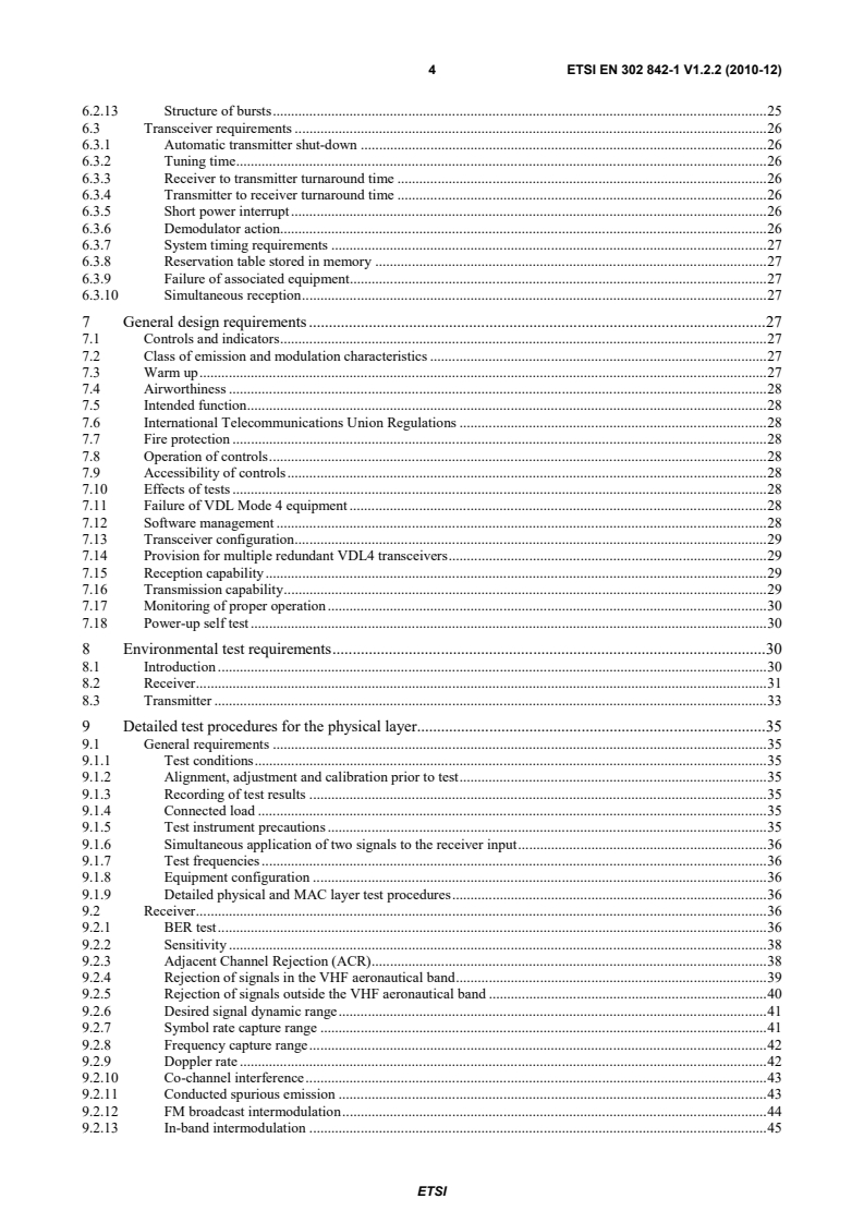 ETSI ETSI EN 302 842-1 V1.2.2 (2010-12) 4 6.2.13 Structure of bursts . 25 6.3 Transceiver requirements . 26 6.3.1 Automatic transmitter shut-down . 26 6.3.2 Tuning time . 26 6.3.3 Receiver to transmitter turnaround time . 26 6.3.4 Transmitter to receiver turnaround time . 26 6.3.5 Short power interrupt . 26 6.3.6 Demodulator action. 26 6.3.7 System timing requirements . 27 6.3.8 Reservation table stored in memory . 27 6.3.9 Failure of associated equipment . 27 6.3.10 Simultaneous reception . 27 7 General design requirements . 27 7.1 Controls and indicators . 27 7.2 Class of emission and modulation characteristics . 27 7.3 Warm up . 27 7.4 Airworthiness . 28 7.5 Intended function . 28 7.6 International Telecommunications Union Regulations . 28 7.7 Fire protection . 28 7.8 Operation of controls . 28 7.9 Accessibility of controls . 28 7.10 Effects of tests . 28 7.11 Failure of VDL Mode 4 equipment . 28 7.12 Software management . 28 7.13 Transceiver configuration . 29 7.14 Provision for multiple redundant VDL4 transceivers . 29 7.15 Reception capability . 29 7.16 Transmission capability . 29 7.17 Monitoring of proper operation . 30 7.18 Power-up self test . 30 8 Environmental test requirements . 30 8.1 Introduction . 30 8.2 Receiver . 31 8.3 Transmitter . 33 9 Detailed test procedures for the physical layer . 35 9.1 General requirements . 35 9.1.1 Test conditions . 35 9.1.2 Alignment, adjustment and calibration prior to test . 35 9.1.3 Recording of test results . 35 9.1.4 Connected load . 35 9.1.5 Test instrument precautions . 35 9.1.6 Simultaneous application of two signals to the receiver input . 36 9.1.7 Test frequencies . 36 9.1.8 Equipment configuration . 36 9.1.9 Detailed physical and MAC layer test procedures . 36 9.2 Receiver . 36 9.2.1 BER test . 36 9.2.2 Sensitivity . 38 9.2.3 Adjacent Channel Rejection (ACR) . 38 9.2.4 Rejection of signals in the VHF aeronautical band . 39 9.2.5 Rejection of signals outside the VHF aeronautical band . 40 9.2.6 Desired signal dynamic range . 41 9.2.7 Symbol rate capture range . 41 9.2.8 Frequency capture range . 42 9.2.9 Doppler rate . 42 9.2.10 Co-channel interference . 43 9.2.11 Conducted spurious emission . 43 9.2.12 FM broadcast intermodulation . 44 9.2.13 In-band intermodulation . 45 SIST EN 302 842-1 V1.2.2:2011