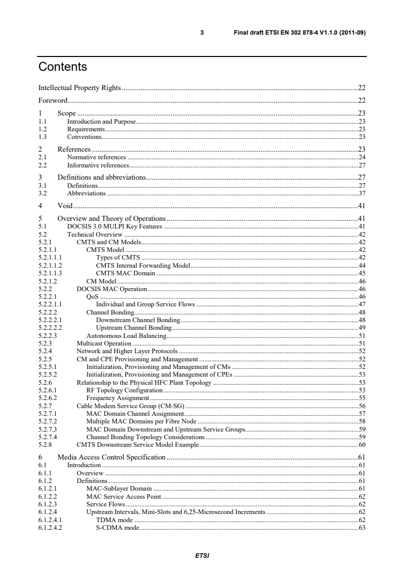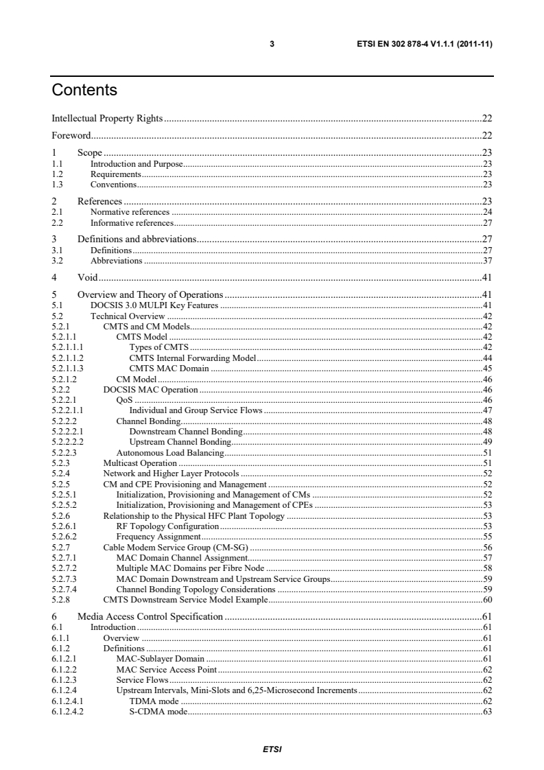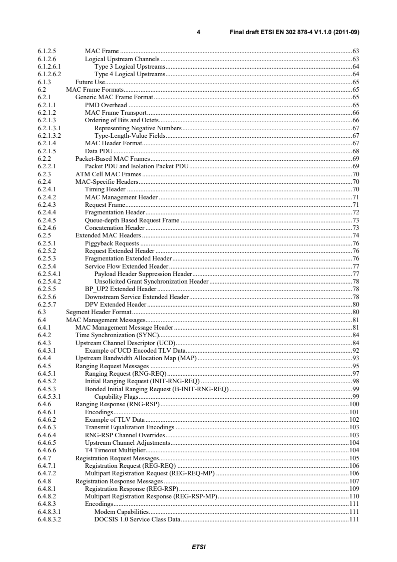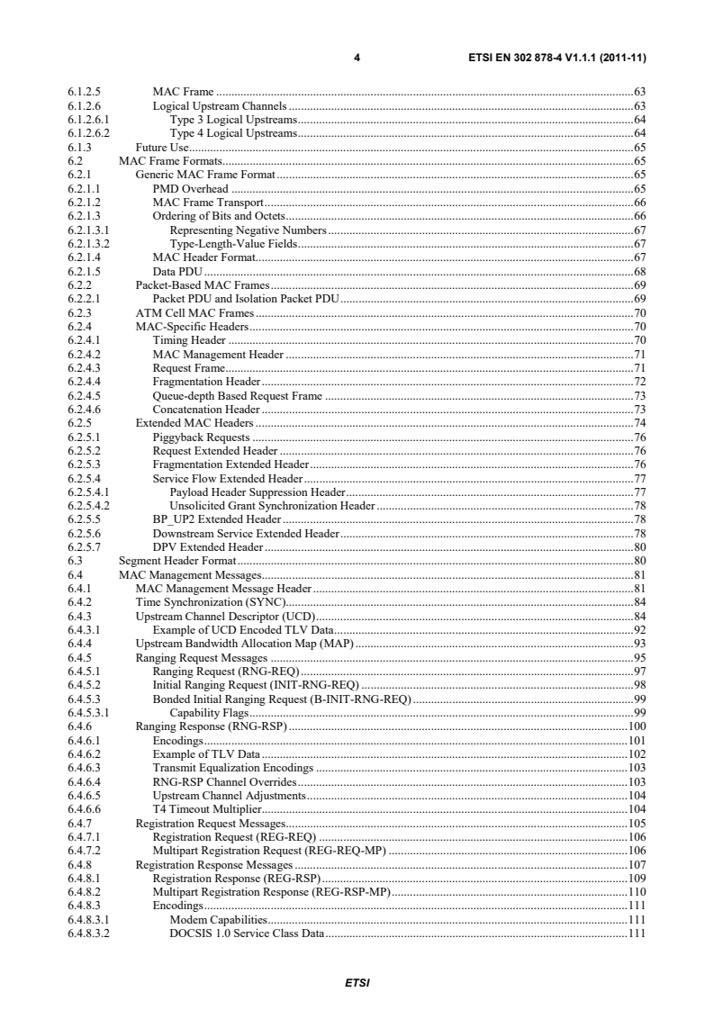 ETSI ETSI EN 302 878-4 V1.1.1 (2011-11) 4 6.1.2.5 MAC Frame . 63 6.1.2.6 Logical Upstream Channels . 63 6.1.2.6.1 Type 3 Logical Upstreams . 64 6.1.2.6.2 Type 4 Logical Upstreams . 64 6.1.3 Future Use . 65 6.2 MAC Frame Formats. 65 6.2.1 Generic MAC Frame Format . 65 6.2.1.1 PMD Overhead . 65 6.2.1.2 MAC Frame Transport . 66 6.2.1.3 Ordering of Bits and Octets . 66 6.2.1.3.1 Representing Negative Numbers . 67 6.2.1.3.2 Type-Length-Value Fields . 67 6.2.1.4 MAC Header Format. 67 6.2.1.5 Data PDU . 68 6.2.2 Packet-Based MAC Frames . 69 6.2.2.1 Packet PDU and Isolation Packet PDU . 69 6.2.3 ATM Cell MAC Frames . 70 6.2.4 MAC-Specific Headers . 70 6.2.4.1 Timing Header . 70 6.2.4.2 MAC Management Header . 71 6.2.4.3 Request Frame . 71 6.2.4.4 Fragmentation Header . 72 6.2.4.5 Queue-depth Based Request Frame . 73 6.2.4.6 Concatenation Header . 73 6.2.5 Extended MAC Headers . 74 6.2.5.1 Piggyback Requests . 76 6.2.5.2 Request Extended Header . 76 6.2.5.3 Fragmentation Extended Header . 76 6.2.5.4 Service Flow Extended Header . 77 6.2.5.4.1 Payload Header Suppression Header . 77 6.2.5.4.2 Unsolicited Grant Synchronization Header . 78 6.2.5.5 BP_UP2 Extended Header . 78 6.2.5.6 Downstream Service Extended Header . 78 6.2.5.7 DPV Extended Header . 80 6.3 Segment Header Format . 80 6.4 MAC Management Messages. 81 6.4.1 MAC Management Message Header . 81 6.4.2 Time Synchronization (SYNC). 84 6.4.3 Upstream Channel Descriptor (UCD) . 84 6.4.3.1 Example of UCD Encoded TLV Data . 92 6.4.4 Upstream Bandwidth Allocation Map (MAP) . 93 6.4.5 Ranging Request Messages . 95 6.4.5.1 Ranging Request (RNG-REQ) . 97 6.4.5.2 Initial Ranging Request (INIT-RNG-REQ) . 98 6.4.5.3 Bonded Initial Ranging Request (B-INIT-RNG-REQ) . 99 6.4.5.3.1 Capability Flags . 99 6.4.6 Ranging Response (RNG-RSP) . 100 6.4.6.1 Encodings . 101 6.4.6.2 Example of TLV Data . 102 6.4.6.3 Transmit Equalization Encodings . 103 6.4.6.4 RNG-RSP Channel Overrides . 103 6.4.6.5 Upstream Channel Adjustments . 104 6.4.6.6 T4 Timeout Multiplier. 104 6.4.7 Registration Request Messages . 105 6.4.7.1 Registration Request (REG-REQ) . 106 6.4.7.2 Multipart Registration Request (REG-REQ-MP) . 106 6.4.8 Registration Response Messages . 107 6.4.8.1 Registration Response (REG-RSP) . 109 6.4.8.2 Multipart Registration Response (REG-RSP-MP) . 110 6.4.8.3 Encodings . 111 6.4.8.3.1 Modem Capabilities . 111 6.4.8.3.2 DOCSIS 1.0 Service Class Data . 111 SIST EN 302 878-4 V1.1.1:2012
