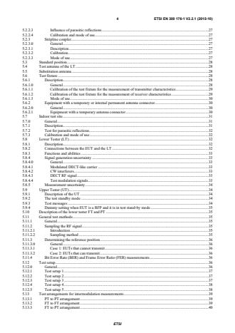 ETSI ETSI EN 300 176-1 V2.2.1 (2015-10) 4 5.2.2.3 Influence of parasitic reflections . 27 5.2.2.4 Calibration and mode of use. 27 5.2.3 Stripline coupler . 27 5.2.3.0 General . 27 5.2.3.1 Description . 27 5.2.3.2 Calibration . 27 5.2.3.3 Mode of use . 27 5.3 Standard position . 28 5.4 Test antenna of the LT . 28 5.5 Substitution antenna . 28 5.6 Test fixture . 28 5.6.1 Description . 28 5.6.1.0 General . 28 5.6.1.1 Calibration of the test fixture for the measurement of transmitter characteristics . 29 5.6.1.2 Calibration of the test fixture for the measurement of receiver characteristics . 29 5.6.1.3 Mode of use . 30 5.6.2 Equipment with a temporary or internal permanent antenna connector. 30 5.6.2.0 General . 30 5.6.2.1 Equipment with a temporary antenna connector . 30 5.7 Indoor test site . 31 5.7.0 General . 31 5.7.1 Description . 31 5.7.2 Test for parasitic reflections. 32 5.7.3 Calibration and mode of use . 32 5.8 Lower Tester (LT) . 32 5.8.1 Description . 32 5.8.2 Connections between the EUT and the LT . 32 5.8.3 Functions and abilities . 33 5.8.4 Signal generation uncertainty . 33 5.8.4.0 General . 33 5.8.4.1 Modulated DECT-like carrier . 33 5.8.4.2 CW interferers . 33 5.8.4.3 DECT RF signal . 33 5.8.4.4 Test modulation signals . 33 5.8.5 Measurement uncertainty . 34 5.9 Upper Tester (UT) . 34 5.9.1 Description of the UT . 34 5.9.2 The test standby mode . 34 5.9.3 Test messages . 34 5.9.4 Dummy setting when EUT is a RFP and it is in test stand-by mode . 35 5.10 Description of the lower tester FT and PT . 35 5.11 General test methods . 35 5.11.1 General . 35 5.11.2 Sampling the RF signal . 35 5.11.2.1 Introduction . 35 5.11.2.2 Sampling method . 35 5.11.3 Determining the reference position . 36 5.11.3.0 General . 36 5.11.3.1 Case 1: EUTs that cannot transmit . 36 5.11.3.2 Case 2: EUTs that can transmit . 36 5.11.4 Bit Error Rate (BER) and Frame Error Ratio (FER) measurements . 36 5.12 Test setup. 36 5.12.0 General . 36 5.12.1 Test setup 1 . 37 5.12.2 Test setup 2 . 37 5.12.3 Test setup 3 . 37 5.12.4 Test setup 4 . 38 5.12.5 Test setup 5 . 38 5.13 Test arrangements for intermodulation measurements . 39 5.13.1 PT to PT arrangement . 39 5.13.2 FT to FT arrangement . 39 5.13.3 FT to PT arrangement . 40 SIST EN 300 176-1 V2.2.1:2016