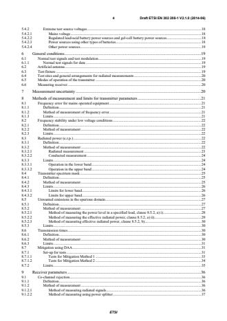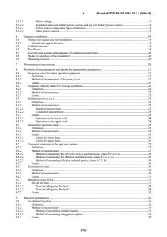 ETSI ETSI EN 302 208-1 V2.1.1 (2015-02) 4 5.4.2.1 Mains voltage . 18 5.4.2.2 Regulated lead-acid battery power sources and gel-cell battery power sources . 18 5.4.2.3 Power sources using other types of batteries . 18 5.4.2.4 Other power sources . 19 6 General conditions . 19 6.1 Normal test signals and test modulation . 19 6.1.1 Normal test signals for data . 19 6.2 Artificial antenna . 19 6.3 Test fixture . 19 6.4 Test sites and general arrangements for radiated measurements . 20 6.5 Modes of operation of the transmitter . 20 6.6 Measuring receiver . 20 7 Measurement uncertainty . 20 8 Methods of measurement and limits for transmitter parameters . 21 8.1 Frequency error for mains operated equipment . 21 8.1.1 Definition . 21 8.1.2 Method of measurement of frequency error. 21 8.1.3 Limits . 21 8.2 Frequency stability under low voltage conditions . 22 8.2.1 Definition . 22 8.2.2 Method of measurement . 22 8.2.3 Limits . 22 8.3 Radiated power (e.r.p.) . 22 8.3.1 Definition . 22 8.3.2 Method of measurement . 22 8.3.2.1 Radiated measurement . 23 8.3.2.2 Conducted measurement . 24 8.3.3 Limits . 24 8.3.3.1 Operation in the lower band . 24 8.3.3.2 Operation in the upper band . 24 8.4 Transmitter spectrum mask . 25 8.4.1 Definition . 25 8.4.2 Method of measurement . 25 8.4.3 Limits . 26 8.4.3.1 Limits for lower band . 26 8.4.3.2 Limits for upper band . 26 8.5 Unwanted emissions in the spurious domain. 27 8.5.1 Definition . 27 8.5.2 Method of measurement . 27 8.5.2.1 Method of measuring the power level in a specified load, clause 8.5.2, a) i). 28 8.5.2.2 Method of measuring the effective radiated power, clause 8.5.2, a) ii). 29 8.5.2.3 Method of measuring effective radiated power, clause 8.5.2, b) . 30 8.5.3 Limits . 30 8.6 Transmission times . 30 8.6.1 Definition . 30 8.6.2 Method of measurement . 30 8.6.3 Limits . 31 8.7 Mitigation using DAA . 31 8.7.1 Set-up for tests . 31 8.7.1.1 Tests for Mitigation Method 1 . 32 8.7.1.2 Tests for Mitigation Method 2 . 34 8.7.2 Limits . 35 9 Receiver parameters . 36 9.1 Co-channel rejection. 36 9.1.1 Definition . 36 9.1.2 Method of measurement . 36 9.1.2.1 Method of measuring radiated signals. 36 9.1.2.2 Method of measuring using power splitter . 37 9.1.3 Limits . 37 SIST EN 302 208-1 V2.1.1:2015