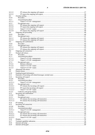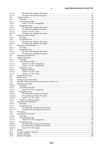 ETSI ETSI EN 300 444 V2.5.1 (2017-10) 4 8.2.2.2 PT releases the outgoing call request . 37 8.2.2.3 FT rejects the outgoing call request . 38 8.3 Overlap sending . 38 8.3.0 Procedure . 38 8.3.1 Associated procedure . 39 8.3.1.1 Timer F- management . 39 8.3.2 Exceptional cases . 39 8.3.2.1 PT releases the outgoing call request . 39 8.3.2.2 FT rejects the outgoing call request . 39 8.3.2.3 Timer F- expiry . 40 8.3.2.4 FT releases the outgoing call request . 40 8.4 Outgoing call proceeding . 40 8.4.0 Procedure . 40 8.4.1 Exceptional cases . 41 8.4.1.1 PT releases the outgoing call request . 41 8.4.1.2 FT releases the outgoing call request . 41 8.5 Outgoing call confirmation. 42 8.5.0 Procedure . 42 8.5.1 Exceptional cases . 42 8.5.1.1 PT releases the outgoing call request . 42 8.5.1.2 FT releases the outgoing call request . 43 8.6 Outgoing call connection . 43 8.7 Normal call release . 44 8.7.0 Procedure . 44 8.7.1 Associated procedures . 45 8.7.1.1 Timer P- management . 45 8.7.1.2 Timer F- management . 45 8.7.2 Exceptional cases . 45 8.7.2.1 Release collisions . 45 8.7.2.2 Timer F- expiry . 46 8.7.2.3 Timer P- expiry . 47 8.8 Abnormal call release . 47 8.9 Partial release . 48 8.10 Sending keypad information. 49 8.11 Summary of incoming call related messages, normal cases . 50 8.12 Incoming call request . 50 8.12.0 Procedure . 50 8.12.1 Associated procedure . 51 8.12.1.1 Timer F- management . 51 8.12.2 Exceptional cases . 52 8.12.2.1 FT releases the incoming call request . 52 8.12.2.2 PT rejects the incoming call request . 52 8.12.2.3 Timer F- expiry . 53 8.12.3 Collective and group ringing . 53 8.13 Incoming call confirmation . 53 8.13.0 Procedure . 53 8.13.1 Exceptional cases . 54 8.13.1.1 FT releases the incoming call transaction . 54 8.13.1.2 PT releases the incoming call transaction . 54 8.14 PT alerting . 55 8.15 Incoming call connection . 55 8.15.0 Procedure . 55 8.15.1 Associated procedure . 56 8.15.1.1 Timer P- management . 56 8.15.2 Exceptional cases . 56 8.15.2.1 FT releases the incoming call transaction . 56 8.15.2.2 PT releases the incoming call transaction . 57 8.15.2.3 Timer P- expiry . 57 8.16 Display . 58 8.17 Terminal capability indication . 58 8.18 Internal call setup . 60 8.19 Internal call keypad . 60 SIST EN 300 444 V2.5.1:2017