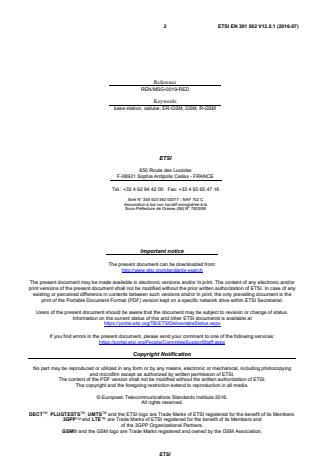 DECTTM, PLUGTESTSTM, UMTSTM and the ETSI logo are Trade Marks of ETSI registered for the benefit of its Members. 3GPPTM and LTE™ are Trade Marks of ETSI registered for the benefit of its Members and of the 3GPP Organizational Partners. GSM® and the GSM logo are Trade Marks registered and owned by the GSM Association. SIST EN 301 502 V12.5.1:2016