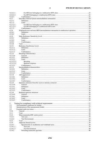 ETSI ETSI EN 301 502 V12.5.1 (2016-07) 4 4.2.6.2.1 For BTS not belonging to a multicarrier BTS class . 23 4.2.6.2.2 For BTS belonging to a multicarrier BTS class . 23 4.2.6.3 Conformance . 23 4.2.7 Intra Base Station System intermodulation attenuation . 24 4.2.7.1 Definition . 24 4.2.7.2 Limit . 24 4.2.7.2.1 For BTS not belonging to a multicarrier BTS class . 24 4.2.7.2.2 For BTS belonging to a multicarrier BTS class . 24 4.2.7.3 Conformance . 24 4.2.8 Wideband noise and intra BSS intermodulation attenuation in multicarrier operation . 24 4.2.8.1 Definition . 24 4.2.8.2 Limit . 24 4.2.9 Static Reference Sensitivity Level . 26 4.2.9.1 Definition . 26 4.2.9.2 Limit . 26 4.2.9.3 Conformance . 27 4.2.10 Void . 27 4.2.11 Reference Interference Level . 27 4.2.11.1 Definition . 27 4.2.11.2 Limit . 27 4.2.11.3 Conformance . 33 4.2.12 Blocking Characteristics . 33 4.2.12.0 General . 33 4.2.12.1 Definition . 34 4.2.12.2 Limit . 34 4.2.12.2.1 Blocking . 34 4.2.12.2.2 Spurious response . 35 4.2.12.3 Conformance . 35 4.2.13 Intermodulation characteristics . 35 4.2.13.1 Definition . 35 4.2.13.2 Limit . 35 4.2.13.3 Conformance . 35 4.2.14 AM suppression . 35 4.2.14.1 Definition . 35 4.2.14.2 Limit . 35 4.2.14.3 Conformance . 36 4.2.15 Spurious emissions from the receiver antenna connector . 36 4.2.15.0 General . 36 4.2.15.1 Definition . 36 4.2.15.2 Limit . 36 4.2.15.3 Conformance . 36 4.2.16 Radiated spurious emissions . 36 4.2.16.0 General . 36 4.2.16.1 Definition . 36 4.2.16.2 Limit . 36 4.2.16.3 Conformance . 36 5 Testing for compliance with technical requirements . 37 5.1 Environmental conditions for testing . 37 5.2 Interpretation of the measurement results . 37 5.3 Essential radio test suites . 38 5.3.0 General . 38 5.3.1 Void . 38 5.3.2 Mean transmitted RF carrier power . 38 5.3.2.1 Test case . 38 5.3.2.2 Test Environment . 39 5.3.3 Void . 39 5.3.4 Adjacent channel power . 39 5.3.4.1 Spectrum due to modulation and wideband noise . 39 5.3.4.1.1 Test case . 39 5.3.4.1.2 Test Environment . 40 5.3.4.2 Switching transients spectrum . 40 SIST EN 301 502 V12.5.1:2016