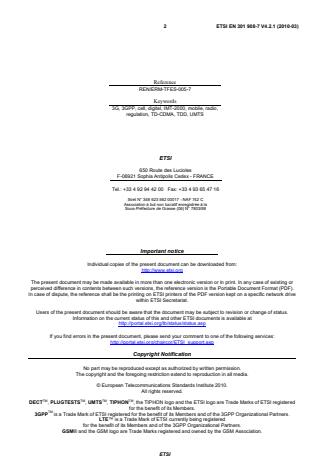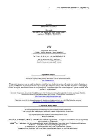 ETSI ETSI EN 301 908-7 V4.2.1 (2010-03) 7 Part 10: "Harmonized EN for IMT-2000, FDMA/TDMA (DECT) covering essential requirements of article 3.2 of the R&TTE Directive"; Part 11: "Harmonized EN for IMT-2000, CDMA Direct Spread (UTRA FDD and E-UTRA FDD) (Repeaters) covering the essential requirements of article 3.2 of the R&TTE Directive"; Part 12: "Harmonized EN for IMT-2000, CDMA Multi-Carrier (cdma2000) (Repeaters) covering the essential requirements of article 3.2 of the R&TTE Directive"; Part 13: "Harmonized EN for IMT-2000, Evolved Universal Terrestrial Radio Access (E-UTRA) (UE) covering the essential requirements of article 3.2 of the R&TTE Directive"; Part 14: "Harmonized EN for IMT-2000, Evolved Universal Terrestrial Radio Access (E-UTRA) (BS) covering the essential requirements of article 3.2 of the R&TTE Directive";