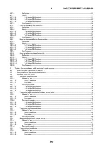 ETSI ETSI EN 301 908-7 V4.2.1 (2010-03) 4 4.2.7.1 Definition . 25 4.2.7.2 Limits . 25 4.2.7.2.1 3,84 Mcps TDD option . 25 4.2.7.2.2 1,28 Mcps TDD option . 25 4.2.7.2.3 7,68 Mcps TDD option . 25 4.2.7.3 Conformance . 26 4.2.8 Receiver blocking characteristics . 26 4.2.8.1 Definition . 26 4.2.8.2 Limits . 26 4.2.8.2.1 3,84 Mcps TDD option . 26 4.2.8.2.2 1,28 Mcps TDD option . 27 4.2.8.2.3 7,68 Mcps TDD option . 29 4.2.8.3 Conformance . 30 4.2.9 Receiver intermodulation characteristics . 30 4.2.9.1 Definition . 30 4.2.9.2 Limits . 30 4.2.9.2.1 3,84 Mcps TDD option . 30 4.2.9.2.2 1,28 Mcps TDD option . 30 4.2.9.2.3 7,68 Mcps TDD option . 31 4.2.9.3 Conformance . 31 4.2.10 Receiver adjacent channel selectivity . 31 4.2.10.1 Definition . 31 4.2.10.2 Limits . 31 4.2.10.2.1 3,84 Mcps TDD option . 31 4.2.10.2.2 1,28 Mcps TDD option . 32 4.2.10.2.3 7,68 Mcps TDD option . 32 4.2.10.3 Conformance . 33 5 Testing for compliance with technical requirements . 33 5.1 Environmental conditions for testing . 33 5.2 Interpretation of the measurement results . 33 5.3 Essential radio test suites . 35 5.3.1 Spectrum emission mask . 35 5.3.1.1 Method of test . 35 5.3.1.1.1 Initial conditions . 35 5.3.1.1.2 Procedure . 38 5.3.1.2 Test requirements . 38 5.3.1.2.1 3,84 Mcps TDD option . 38 5.3.1.2.2 1,28 Mcps TDD option . 39 5.3.1.2.3 7,68 Mcps TDD option . 39 5.3.2 Transmitter adjacent channel leakage power ratio . 39 5.3.2.1 Method of test . 39 5.3.2.1.1 Initial conditions . 39 5.3.2.1.2 Procedure . 41 5.3.2.2 Test requirements . 43 5.3.2.2.1 3,84 Mcps TDD option . 43 5.3.2.2.2 1,28 Mcps TDD option . 43 5.3.2.2.3 7,68 Mcps TDD option . 43 5.3.3 Transmitter spurious emissions . 43 5.3.3.1 Method of test . 43 5.3.3.1.1 Initial conditions . 43 5.3.3.1.2 Procedure . 46 5.3.3.2 Test requirements . 46 5.3.4 Base station maximum output power . 46 5.3.4.1 Method of test . 46 5.3.4.1.1 Initial conditions . 46 5.3.4.1.2 Procedure . 48 5.3.4.2 Test requirements . 48 5.3.5 Transmit intermodulation . 48 5.3.5.1 Method of test . 48 5.3.5.1.1 Initial conditions . 48 5.3.5.1.2 Procedure . 53 SIST EN 301 908-7 V4.2.1:2010