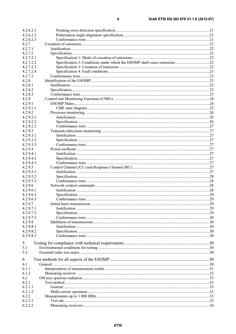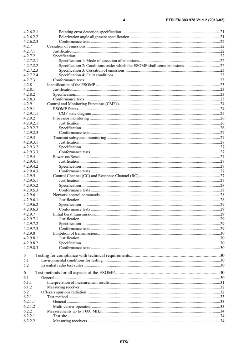 ETSI ETSI EN 303 978 V1.1.2 (2013-02) 4 4.2.6.2.1 Pointing error detection specification . 21 4.2.6.2.2 Polarization angle alignment specification . 21 4.2.6.2.3 Conformance tests . 22 4.2.7 Cessation of emissions . 22 4.2.7.1 Justification . 22 4.2.7.2 Specification. 22 4.2.7.2.1 Specification 1: Mode of cessation of emissions . 22 4.2.7.2.2 Specification 2: Conditions under which the ESOMP shall cease emissions . 22 4.2.7.2.3 Specification 3: Cessation of emissions . 23 4.2.7.2.4 Specification 4: Fault conditions . 23 4.2.7.3 Conformance tests . 23 4.2.8 Identification of the ESOMP . 23 4.2.8.1 Justification . 23 4.2.8.2 Specification. 23 4.2.8.3 Conformance tests . 23 4.2.9 Control and Monitoring Functions (CMFs) . 24 4.2.9.1 ESOMP States . 24 4.2.9.1.1 CMF state diagram . 25 4.2.9.2 Processor monitoring . 26 4.2.9.2.1 Justification . 26 4.2.9.2.2 Specification . 26 4.2.9.2.3 Conformance tests . 27 4.2.9.3 Transmit subsystem monitoring . 27 4.2.9.3.1 Justification . 27 4.2.9.3.2 Specification . 27 4.2.9.3.3 Conformance tests . 27 4.2.9.4 Power-on/Reset . 27 4.2.9.4.1 Justification . 27 4.2.9.4.2 Specification . 27 4.2.9.4.3 Conformance tests . 27 4.2.9.5 Control Channel (CC) and Response Channel (RC) . 27 4.2.9.5.1 Justification . 27 4.2.9.5.2 Specification . 28 4.2.9.5.3 Conformance tests . 28 4.2.9.6 Network control commands . 28 4.2.9.6.1 Justification . 28 4.2.9.6.2 Specification . 29 4.2.9.6.3 Conformance tests . 29 4.2.9.7 Initial burst transmission . 29 4.2.9.7.1 Justification . 29 4.2.9.7.2 Specification . 29 4.2.9.7.3 Conformance tests . 29 4.2.9.8 Inhibition of transmissions . 30 4.2.9.8.1 Justification . 30 4.2.9.8.2 Specification . 30 4.2.9.8.3 Conformance tests . 30 5 Testing for compliance with technical requirements . 30 5.1 Environmental conditions for testing . 30 5.2 Essential radio test suites . 30 6 Test methods for all aspects of the ESOMP . 30 6.1 General . 30 6.1.1 Interpretation of measurement results . 31 6.1.2 Measuring receiver . 32 6.2 Off-axis spurious radiation . 32 6.2.1 Test method . 33 6.2.1.1 General . 33 6.2.1.2 Multi-carrier operation . 33 6.2.2 Measurements up to 1 000 MHz . 34 6.2.2.1 Test site . 34 6.2.2.2 Measuring receivers . 34 SIST EN 303 978 V1.1.2:2013