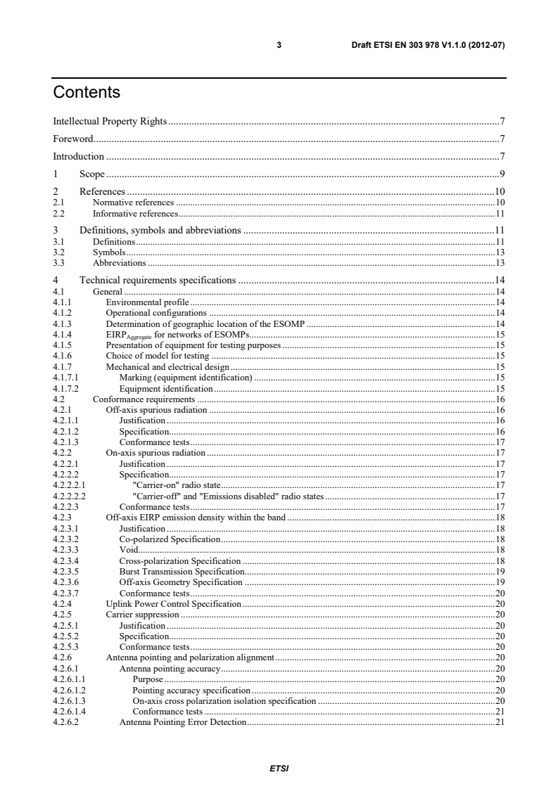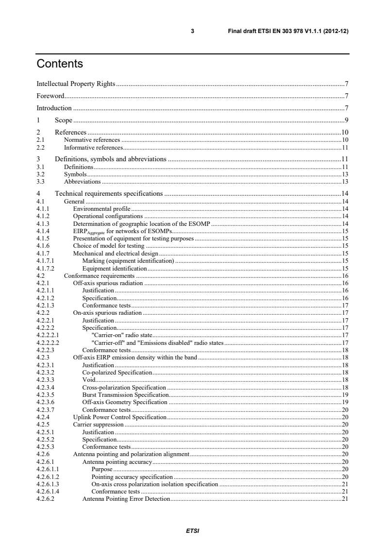 ETSI ETSI EN 303 978 V1.1.2 (2013-02) 3 Contents Intellectual Property Rights . 7 Foreword . 7 Introduction . 7 1 Scope . 9 2 References . 10 2.1 Normative references . 10 2.2 Informative references . 11 3 Definitions, symbols and abbreviations . 11 3.1 Definitions . 11 3.2 Symbols . 13 3.3 Abbreviations . 13 4 Technical requirements specifications . 14 4.1 General . 14 4.1.1 Environmental profile . 14 4.1.2 Operational configurations . 14 4.1.3 Determination of geographic location of the ESOMP . 14 4.1.4 EIRPAggregate for networks of ESOMPs . 15 4.1.5 Presentation of equipment for testing purposes . 15 4.1.6 Choice of model for testing . 15 4.1.7 Mechanical and electrical design . 15 4.1.7.1 Marking (equipment identification) . 15 4.1.7.2 Equipment identification . 15 4.2 Conformance requirements . 16 4.2.1 Off-axis spurious radiation . 16 4.2.1.1 Justification . 16 4.2.1.2 Specification. 16 4.2.1.3 Conformance tests . 17 4.2.2 On-axis spurious radiation . 17 4.2.2.1 Justification . 17 4.2.2.2 Specification. 17 4.2.2.2.1 "Carrier-on" radio state . 17 4.2.2.2.2 "Carrier-off" and "Emissions disabled" radio states . 17 4.2.2.3 Conformance tests . 18 4.2.3 Off-axis EIRP emission density within the band . 18 4.2.3.1 Justification . 18 4.2.3.2 Co-polarized Specification . 18 4.2.3.3 Void. 18 4.2.3.4 Cross-polarization Specification . 18 4.2.3.5 Burst Transmission Specification . 19 4.2.3.6 Off-axis Geometry Specification . 19 4.2.3.7 Conformance tests . 20 4.2.4 Uplink Power Control Specification . 20 4.2.5 Carrier suppression . 20 4.2.5.1 Justification . 20 4.2.5.2 Specification. 20 4.2.5.3 Conformance tests . 20 4.2.6 Antenna pointing and polarization alignment . 20 4.2.6.1 Antenna pointing accuracy . 20 4.2.6.1.1 Purpose . 20 4.2.6.1.2 Pointing accuracy specification . 20 4.2.6.1.3 On-axis cross polarization isolation specification . 21 4.2.6.1.4 Conformance tests . 21 4.2.6.2 Antenna Pointing Error Detection . 21 SIST EN 303 978 V1.1.2:2013