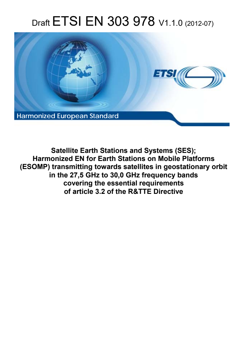 ETSI EN 303 978 V1.1.2 (2013-02) - Satellite Earth Stations and Systems (SES); Harmonized EN for Earth Stations on Mobile Platforms (ESOMP) transmitting towards satellites in geostationary orbit in the 27,5 GHz to 30,0 GHz frequency bands covering the essential requirements of article 3.2 of the R&TTE Directive