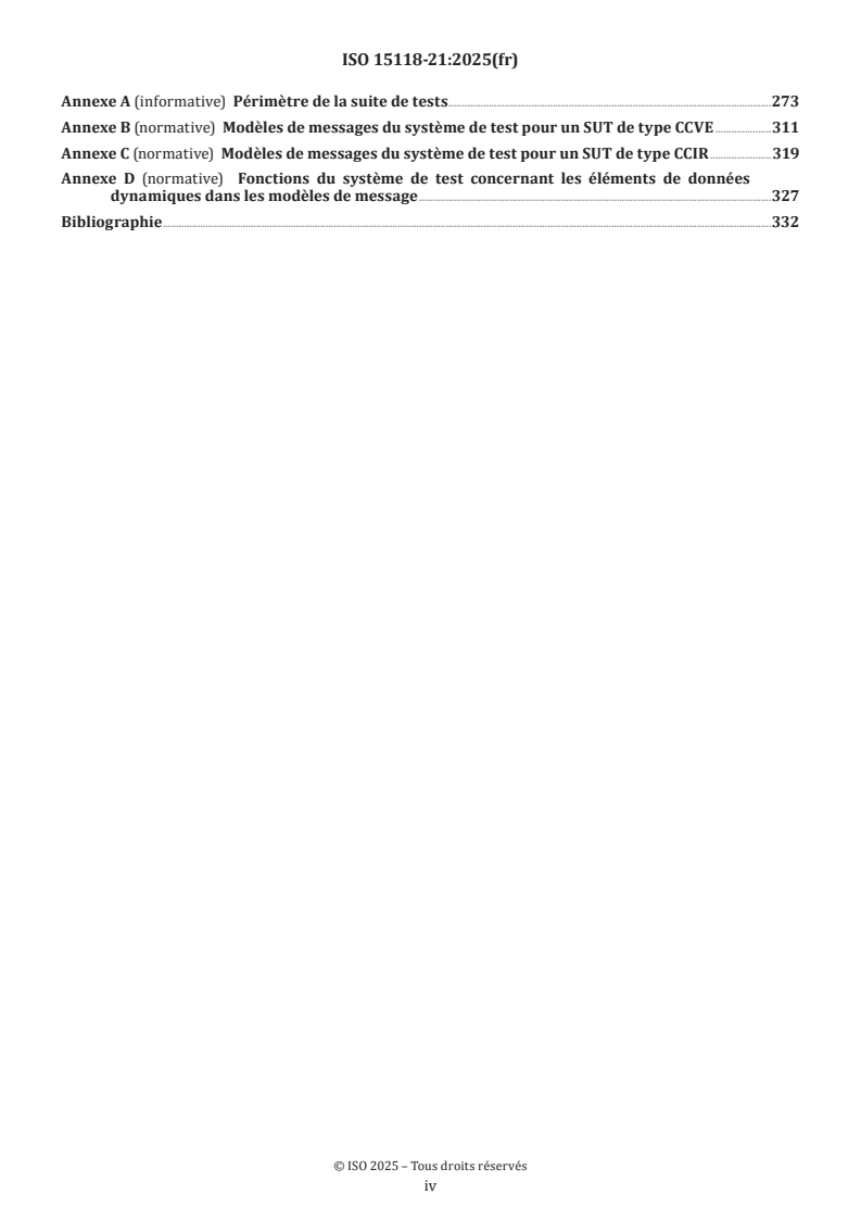 Le présent document ne couvre que les sections normatives et les exigences de l'ISO 15118-20. Le présent document renvoie également vers des tests spécifiques pour les exigences relatives aux normes citées (par exemple, les RFC de l'IETF, les recommandations W3C) si ces tests présentent un intérêt pour la conformité des implémentations conformément à l'ISO 15118-20. Toutefois, le présent document n'a pas pour objet d'élargir le domaine d'application de cette spécification de conformité à de telles normes externes, si cela n'est pas techniquement nécessaire pour les tests de conformité conformément à l'ISO 15118-20. En outre, les tests de conformité spécifiés dans le présent document n'incluent pas l'évaluation des performances, de la robustesse ou de la fiabilité d'une implémentation. Ces tests ne peuvent pas évaluer l'implémentation physique des primitives de services abstraites, la manière dont est implémenté un système, la manière dont celui-ci fournit un service demandé, ou l'environnement d'implémentation du protocole. Par ailleurs, les tests élémentaires abstraits spécifiés dans le présent document couvrent uniquement le protocole de communication et le comportement du système spécifiés par l'ISO 15118-20. Le flux de puissance entre l'IRVE et le VE n'est pas un prérequis pour les tests spécifiés dans le présent document.
