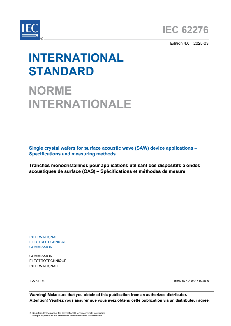 IEC 62276:2025 applies to the manufacture of synthetic quartz, lithium niobate (LN), lithium tantalate (LT), lithium tetraborate (LBO), and lanthanum gallium silicate (LGS) single crystal wafers intended for use as substrates in the manufacture of surface acoustic wave (SAW) filters and resonators.