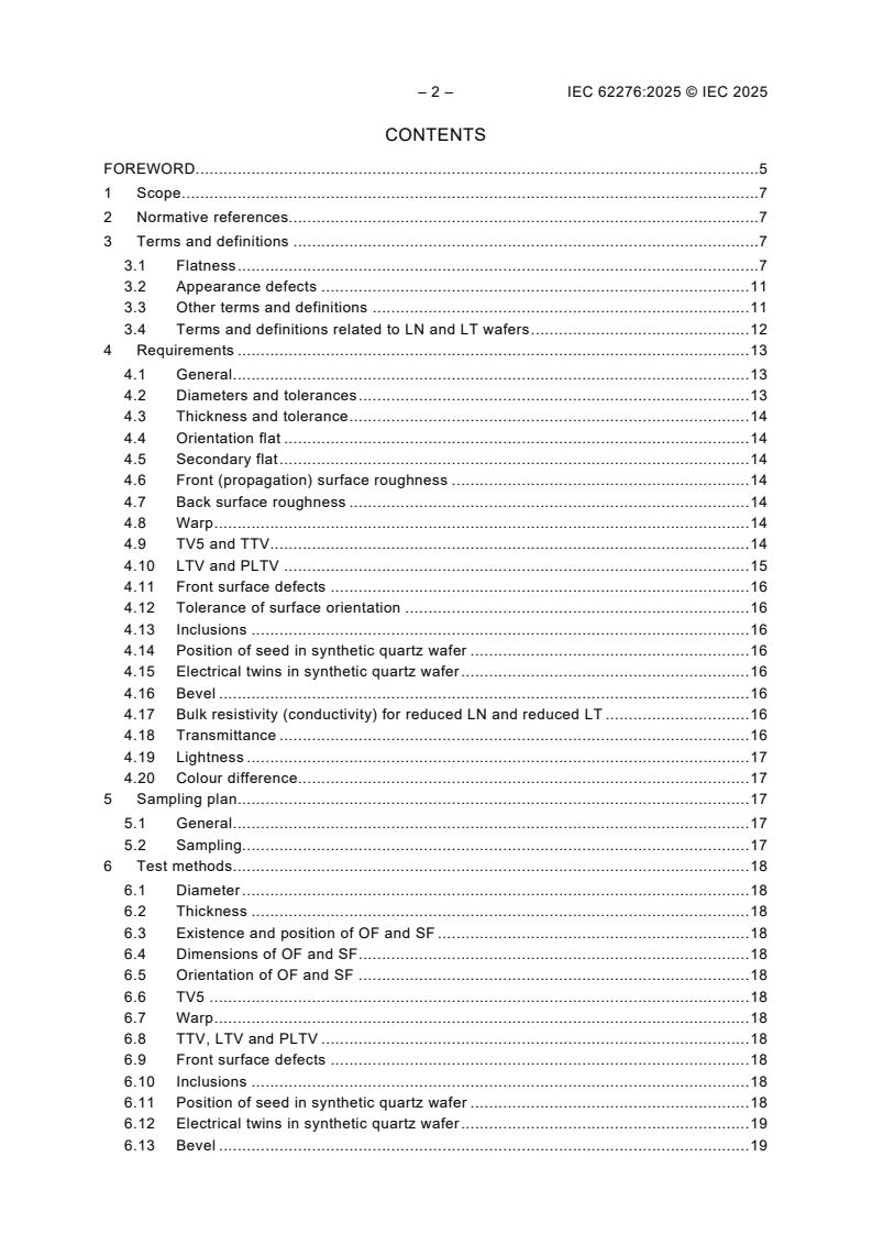 IEC 62276:2025 applies to the manufacture of synthetic quartz, lithium niobate (LN), lithium tantalate (LT), lithium tetraborate (LBO), and lanthanum gallium silicate (LGS) single crystal wafers intended for use as substrates in the manufacture of surface acoustic wave (SAW) filters and resonators. This edition includes the following significant technical changes with respect to the previous edition: a) The terms and definitions, the technical requirements, sampling frequency, test methods and measurement of transmittance, lightness, colour difference for LN and LT have been added in order to meet the needs of industry development; b) The term “inclusion” (mentioned in 4.13 and 6.10) and its definition have been added because there was no definition for it in Clause 3; c) The specification of LTV and PLTV, and the corresponding description of sampling frequency for LN and LT have been added, because they are the key performance parameters for the wafers; d) The tolerance of Curie temperature specification for LN and LT have been added in order to meet the development requirements of the industry; e) Measurement of thickness, TV5, TTV, LTV and PLTV have been completed, including measurement principle and method of thickness, TV5, TTV, LTV and PLTV.