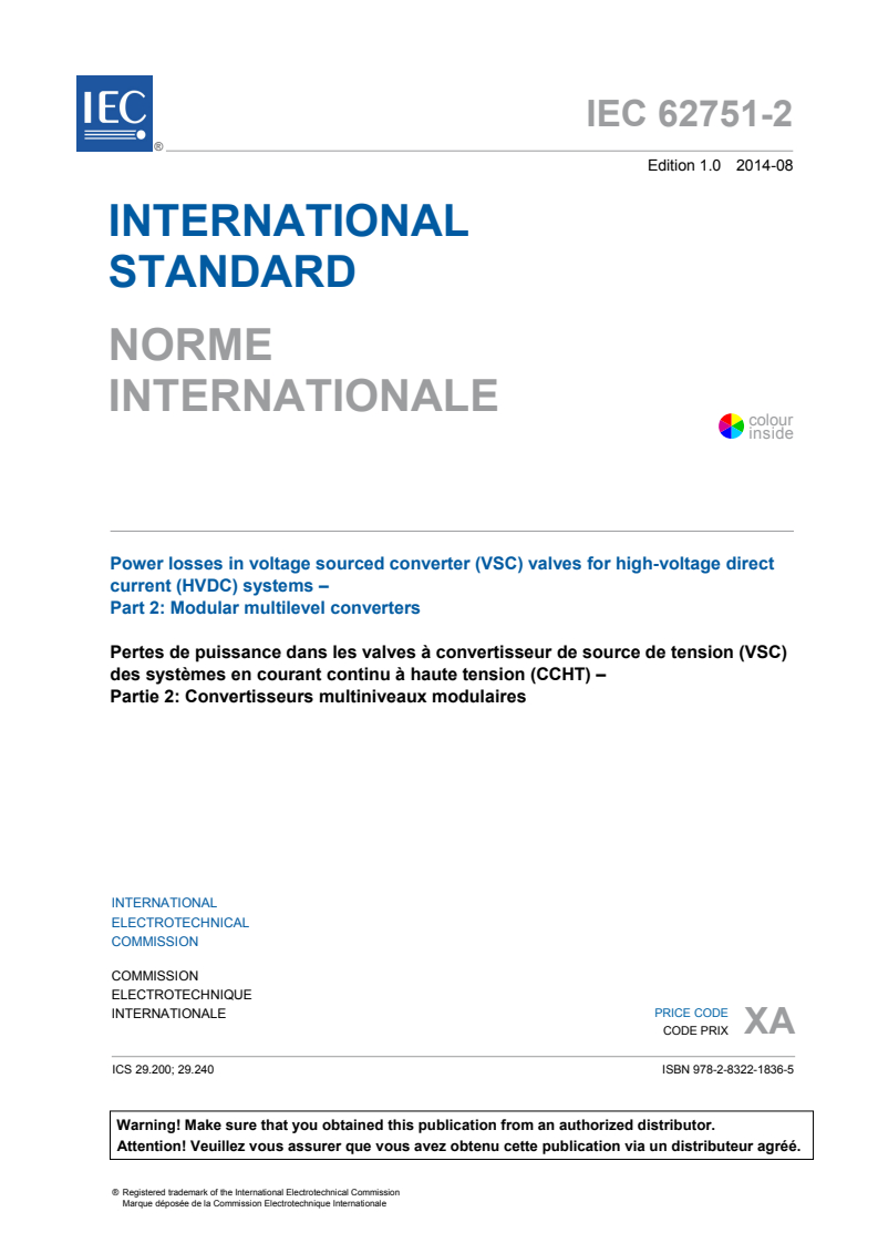 IEC 62751-2:2014 - Power losses in voltage sourced converter (VSC) valves for high-voltage direct current (HVDC) systems - Part 2: Modular multilevel converters Released:8/27/2014