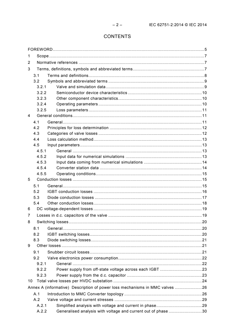 L'IEC 62571-2:2014 donne la méthode détaillée à adopter pour calculer les pertes de puissance dans les valves d'un système CCHT doté d'un "convertisseur multiniveaux modulaire" dont chaque valve est composée d'un certain nombre de sources de tension indépendantes commandables à deux bornes connectées en série. Elle s'applique lorsque chaque cellule modulaire n'utilise qu'un seul dispositif à semi-conducteur blocable dans chaque position de commutation, et lorsque chaque position de commutation est composée d'un certain nombre de dispositifs à semi-conducteur blocables en série (cette topologie étant également appelée "convertisseur à deux niveaux monté en cascade"). Les principales formules sont données pour la configuration "en demi-pont" à deux niveaux. Des lignes directrices sont également données pour indiquer l'étendue des résultats de certains autres types de configurations de bloc module MMC.