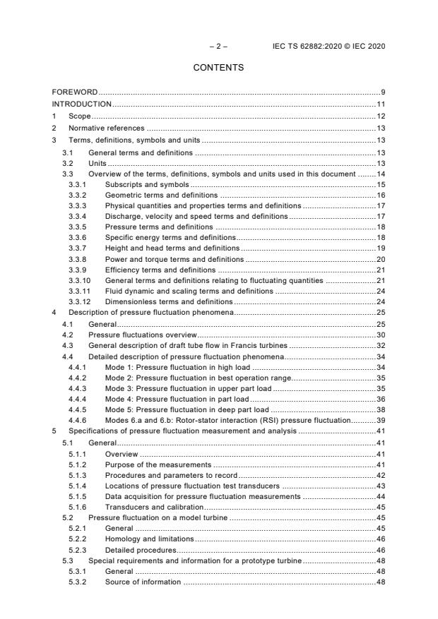 IEC TS 62882:2020 is a Technical Specification that outlines methods for transposing pressure fluctuations in Francis turbines and pump-turbines operating as turbines. The document covers various aspects such as the description of pressure fluctuations and the problems they cause, the characterization of phenomena related to inter-blade vortices, draft tube vortices rope, and rotor-stator interaction. It also discusses the primary parameters that influence pressure fluctuations, ways to measure and analyze them, identification of potential resonances, and methods to transpose measurement results from model to prototype. The document recommends a data acquisition system and presents pressure fluctuation measurements comparing model turbines to prototypes. It further discusses parameters used for transposition, uncertainty factors, and factors influencing transposition. The document also suggests possible methods for mitigating pressure fluctuation and defines its limitations. It excludes hydraulic stability phenomena related to von Karman vortices, transients, runaway speed, and speed no load. Structural details and mechanical properties of the machines are not considered, as long as they do not affect pressure fluctuations or the relationship between model and prototype pressure fluctuations. The document does not cover scaling-up resonance conditions or cases where resonance exists, as the relationship between model and prototype pressure fluctuations cannot be determined under those conditions.
