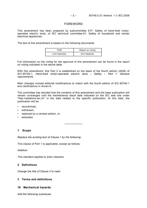 (Amendment)Amendment 1 - Hand-held motor-operated electric tools - Safety - Part 2-21: Particular requirements for drain cleaners