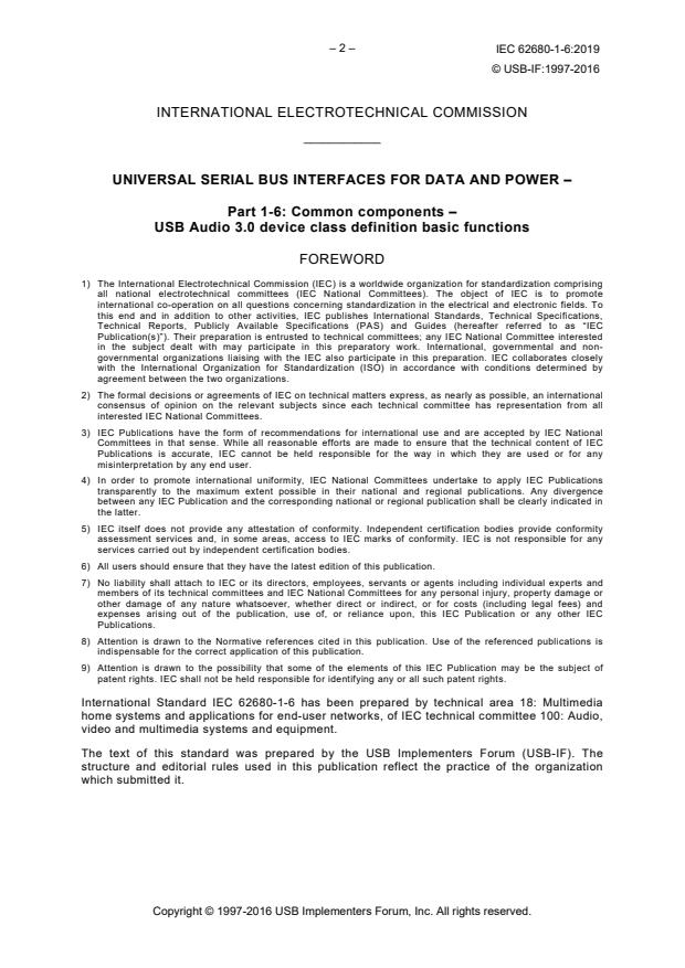The purpose of IEC 62680-1-6:2019 is to create a higher level of interoperability among Hosts and Audio Devices. By establishing a set of essential audio features, users can expect a consistent experience, Device manufacturers have a solid template to follow, and Host drivers may be simplified. The USB Audio Device Class Definition for Basic Audio Functions applies to all USB Audio Functions that are based on the Universal Serial Bus Device Class Definition for Audio Devices Release 3.0. It defines baseline audio functionality for all ADC 3.0 compliant Hosts and Devices.