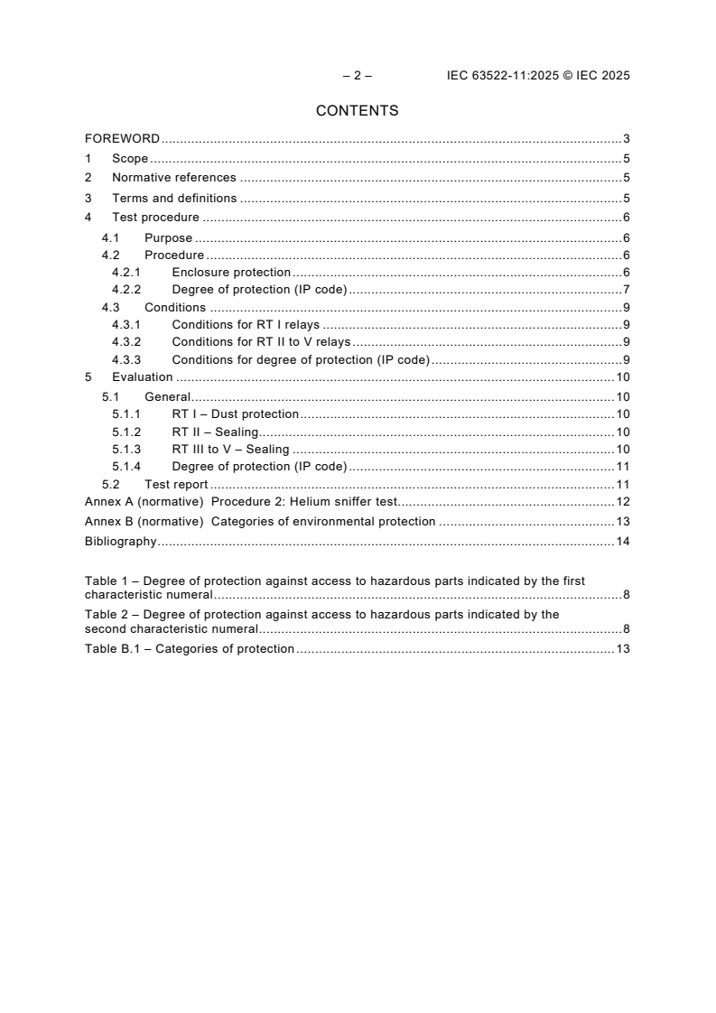 IEC 63522-11:2025 is an international standard published by the International Electrotechnical Commission (IEC) that specifies test methods and measurements related to the enclosure protection and degree of protection of electrical relays. This standard is part 11 of the IEC 63522 series focused on electrical relays - tests and measurements. Its primary objective is to ensure that electrical relay enclosures meet strict criteria for sealing and protection against environmental factors such as dust and water. This guarantees reliable relay performance during transportation, storage, and operational use.