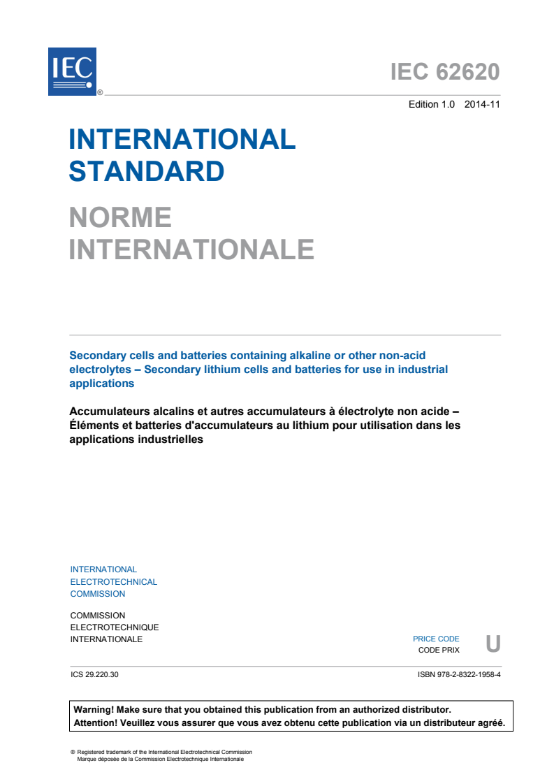 IEC 62620:2014 - Secondary cells and batteries containing alkaline or other non-acid electrolytes - Secondary lithium cells and batteries for use in industrial applications Released:11/25/2014