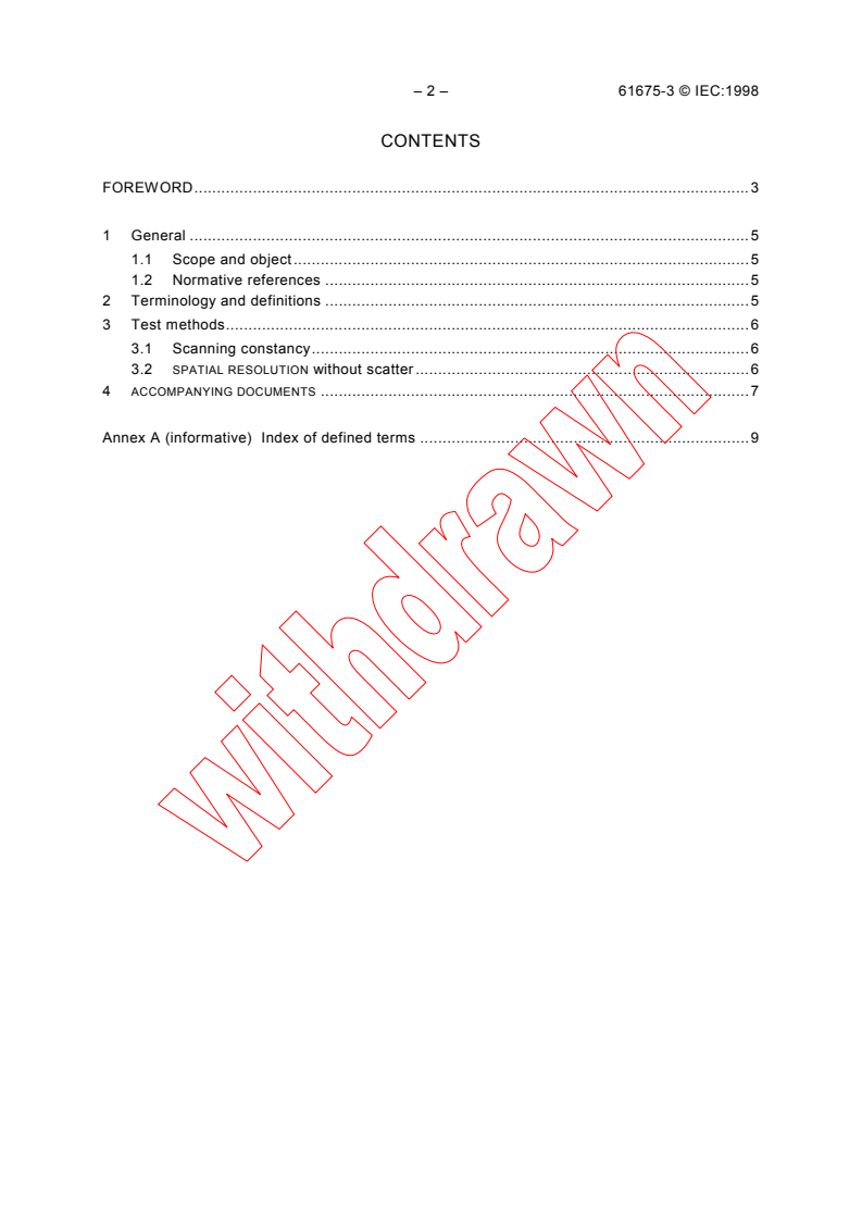 IEC 61675-3:1998 is a standard published by the International Electrotechnical Commission (IEC). Its full title is "Radionuclide imaging devices - Characteristics and test conditions - Part 3: Gamma camera based wholebody imaging systems". This standard covers: IEC 61675-3:1998 specifies test methods for describing the characteristics of gamma camera based wholebody imaging systems. As these systems are based on Anger type gamma cameras this part of IEC 61675 should be read in conjunction with IEC 60789. The test methods specified have been selected to reflect as much as possible the clinical use of gamma camera based wholebody imaging systems. It is intended that the test methods be carried out by manufacturers, thereby enabling them to describe the characteristics of gamma camera based wholebody imaging systems.