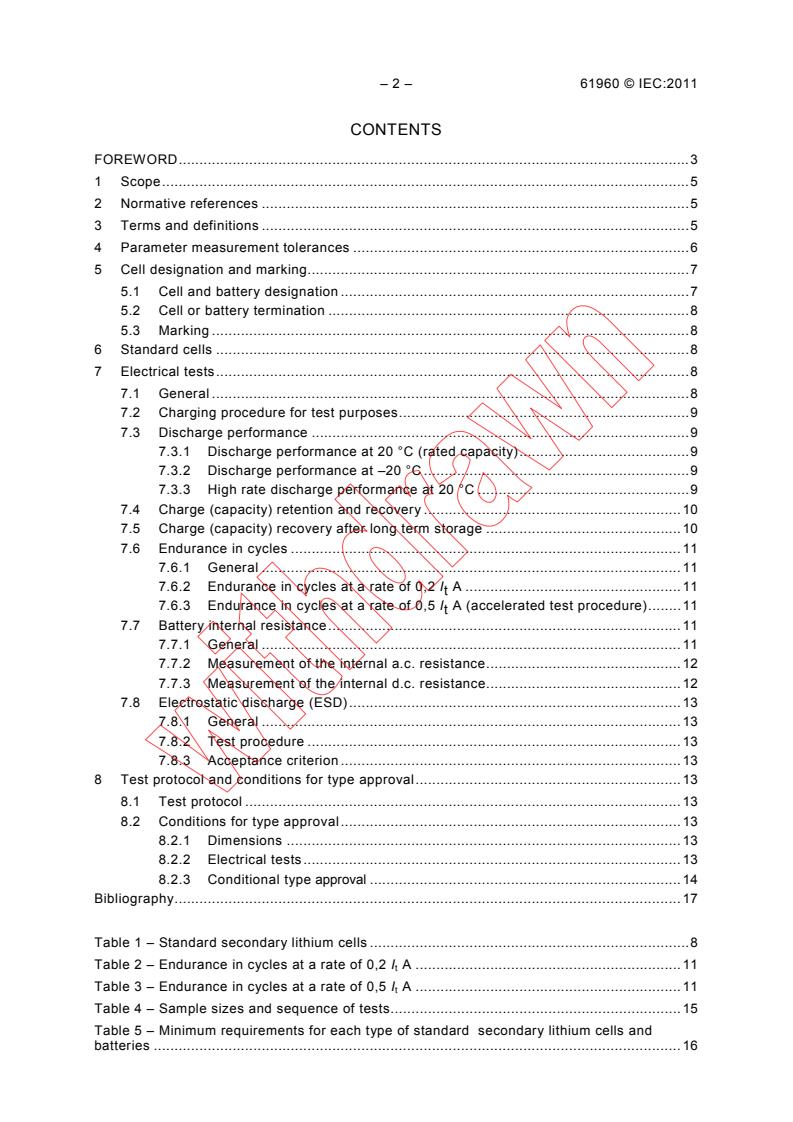 IEC 61960:2011 is a standard published by the International Electrotechnical Commission (IEC). Its full title is "Secondary cells and batteries containing alkaline or other non-acid electrolytes - Secondary lithium cells and batteries for portable applications". This standard covers: IEC 61960:2011 specifies performance tests, designations, markings, dimensions and other requirements for secondary lithium single cells and batteries for portable applications. The objective of this standard is to provide the purchasers and users of secondary lithium cells and batteries with a set of criteria with which they can judge the performance of secondary lithium cells and batteries offered by various manufacturers. This second edition cancels and replaces the first edition published in 2003. It is a technical revision. This edition includes the following significant technical changes with respect to the previous edition: - 7.6 Endurance in cycles: addition of an accelerated test procedure.