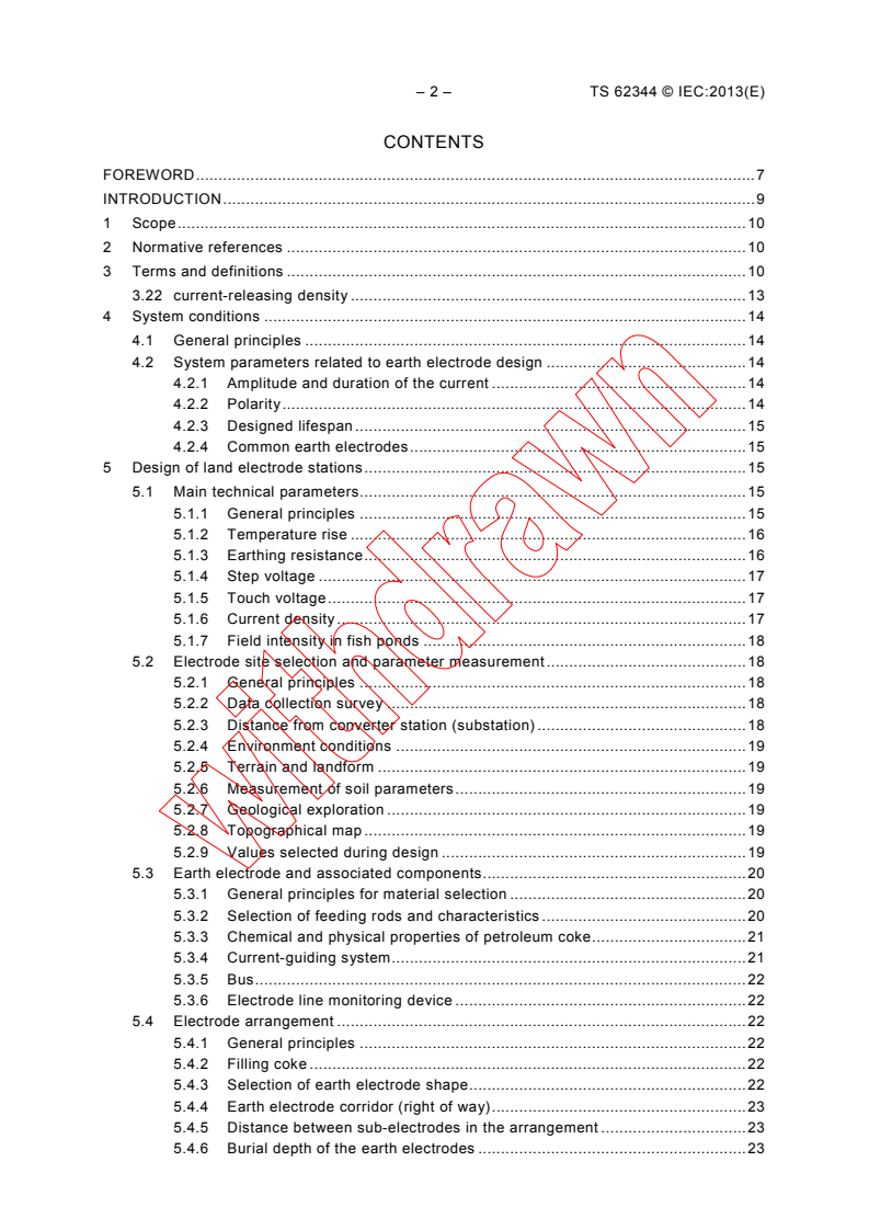 IEC TS 62344:2013 - "Design of earth electrode stations for high-voltage direct current (HVDC) links – General guidelines" is a technical specification published by the IEC in 2013. It provides guidance, limits and precautions for the design of earth electrode stations used in HVDC links to ensure personnel safety, protect electrode assets and minimise impacts on DC transmission systems and the surrounding environment. This edition replaces IEC/PAS 62344 (2007) and constitutes a technical revision.