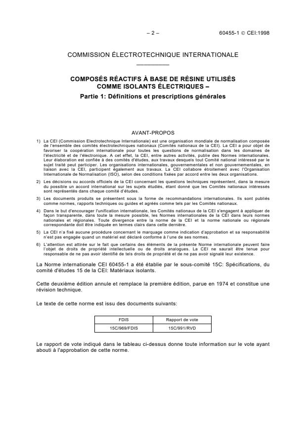 IEC 60455-1:1998 is an international standard published by the International Electrotechnical Commission (IEC) that defines resin based reactive compounds used for electrical insulation. This part 1 of the series focuses on definitions and general requirements concerning these compounds. It sets out designations, classifications based on glass transition temperature, and specifies that all compounds are solvent-free, containing reactive diluents and fillers as needed. Notably, the standard excludes reactive compounds used as coating powders, which are treated separately.