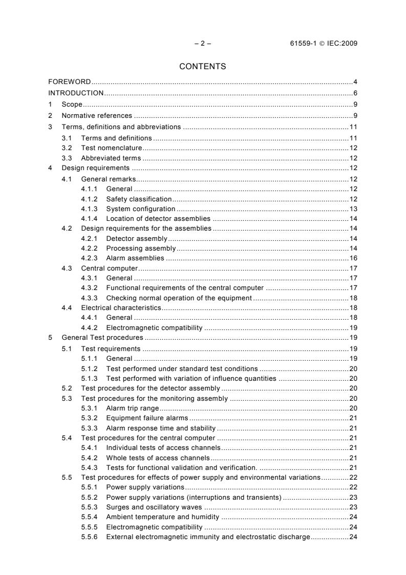 La CEI 61559-1:2009 spécifie les caractéristiques générales, les procédures générales d'essais, les caractéristiques des rayonnements, ainsi que les caractéristiques électriques, de sécurité et environnementales et le certificat d'identification pour les systèmes centralisés destinés à la surveillance en continu des rayonnements et/ou des niveaux de radioactivité installées dans les installations nucléaires, essentiellement pour contribuer à la protection radiologique dans les lieux de travail.