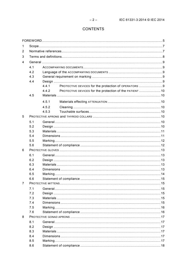 IEC 61331-3:2014 is a standard published by the International Electrotechnical Commission (IEC). Its full title is "Protective devices against diagnostic medical X-radiation - Part 3: Protective clothing, eyewear and protective patient shields". This standard covers: IEC 61331-3:2014 applies to protective devices such as protective clothing and eyewear for the protection of persons against X radiation up to 150 kV, during radiological examinations and interventional procedures. This standard deals with general requirements on the accompanying documents, on design and on materials used and with sizing, particular design features, minimum attenuation properties of materials, marking and standardized forms of statements of compliance with this standard. It covers protective clothing mainly for the protection of the operator, such as: - protective aprons; - thyroid collars; - protective gloves; - protective mittens; and - protective eyewear. It also covers protective devices for the protection of the patient, such as: - protective gonad aprons; - scrotum shields; - ovary shields; - shadow shields; and - protective aprons for dental use. The latter group of protective devices is intended to be used during radiological examinations to minimize the effects of irradiation on the reproductive organs particularly with regard to genetic damage. This second edition cancels and replaces the first edition of IEC 61331-3, published in 1998. It constitutes a technical revision. This second edition has been adapted to apply to the present technology. It includes a requirement to use a better method for the determination of attenuation properties over a broader and more clinically relevant range of radiation qualities appropriate to the use of the devices. It also covers three additional protective devices, thyroid collars, protective eyewear and protective aprons for dental use.