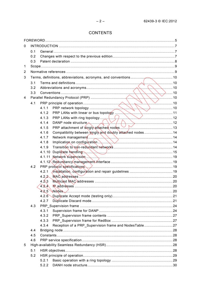 La CEI 62439-3:2012 spécifie deux protocoles de redondance conçus pour assurer une reprise transparente en cas de défaillance unique d'une maille inter-étage ou d'un pont au sein du réseau, qui reposent sur le même schéma: duplication du réseau local, duplication des informations transmises. Cette deuxième édition annule et remplace la première édition parue en 2010. Elle constitue une révision technique. Les principales modifications apportées à l'édition précédente sont: