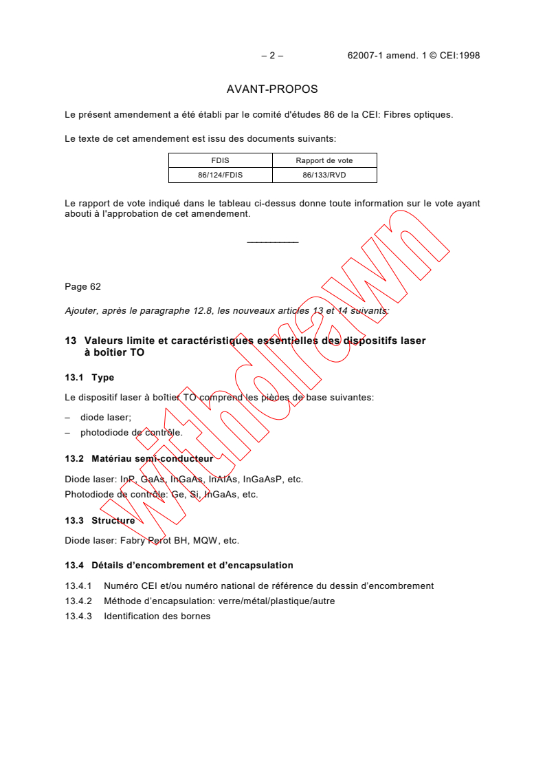 Amendement 1 - Dispositifs optoélectroniques à semiconducteurs pour application dans les systèmes à fibres optiques - Partie 1: Valeurs limites et caractéristiques essentielles
