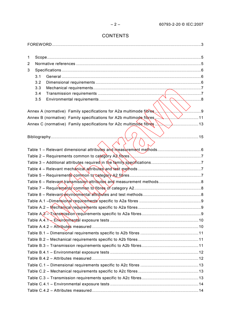 IEC 60793-2-20:2007 is an international standard published by the International Electrotechnical Commission (IEC) that specifies product requirements for category A2 multimode optical fibres. This standard covers optical fibres types A2a, A2b, and A2c, which are primarily used in information transmission equipment and optical fibre cables with lengths typically up to 2 kilometers. It establishes essential specifications including dimensional, mechanical, transmission, and environmental requirements tailored to ensure consistent quality and performance in multimode optical fibres.